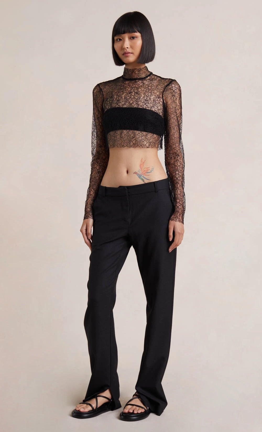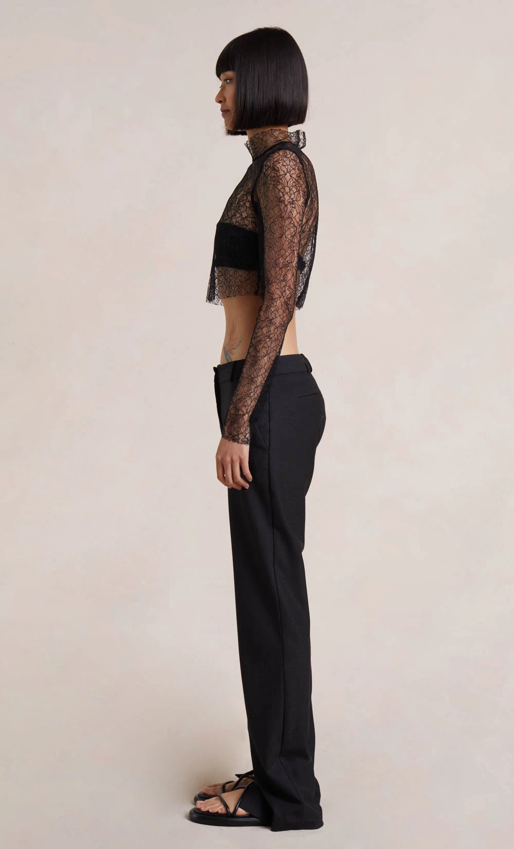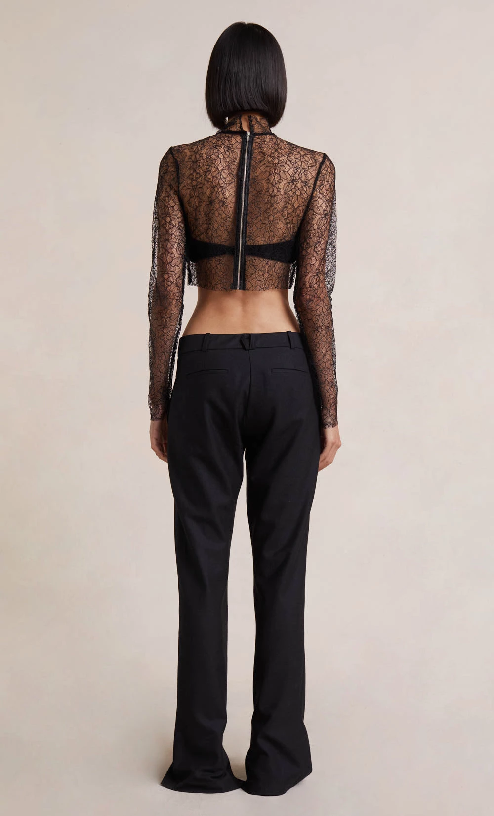 A cropped turtleneck style, the Lace Racer L/S Top is crafted from a sleek lace fabric and features a raw hem. The long-sleeved crop is complemented by contrasting silver hardware. Styled with our Lee Pant.