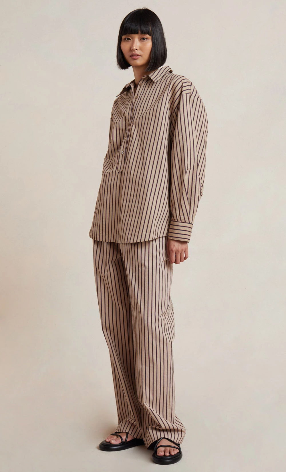 Cut from a signature striped print fabric, the Leroy Shirt is chic and easy-to-wear. The long-sleeved cuffed shirt features a neat collar and pop-over placket closure. Styled with our Leroy Pant.