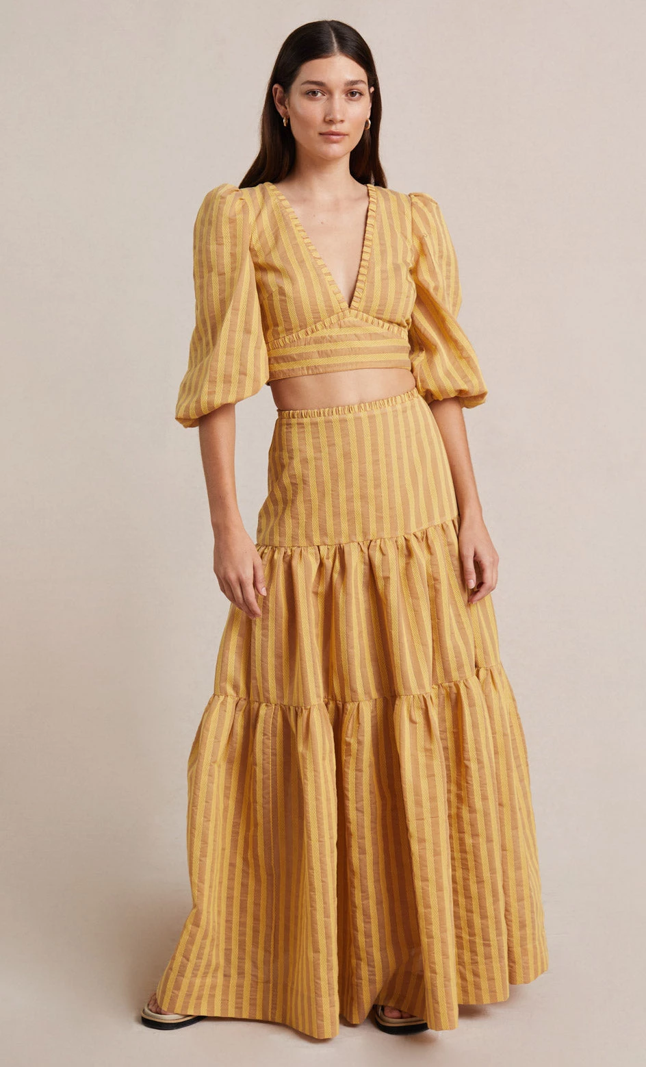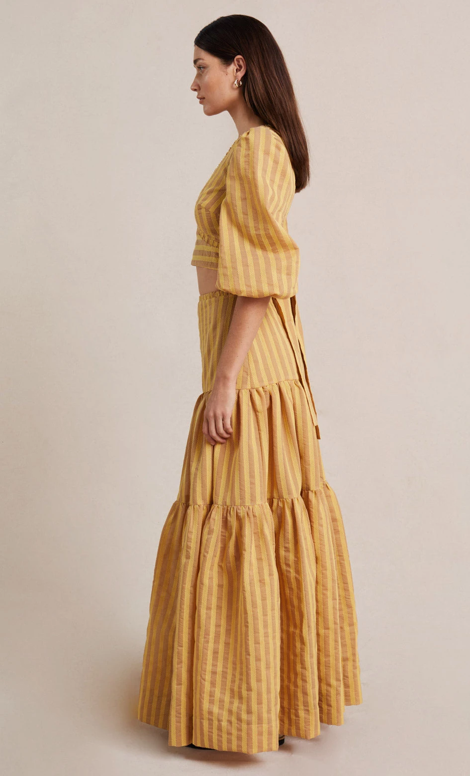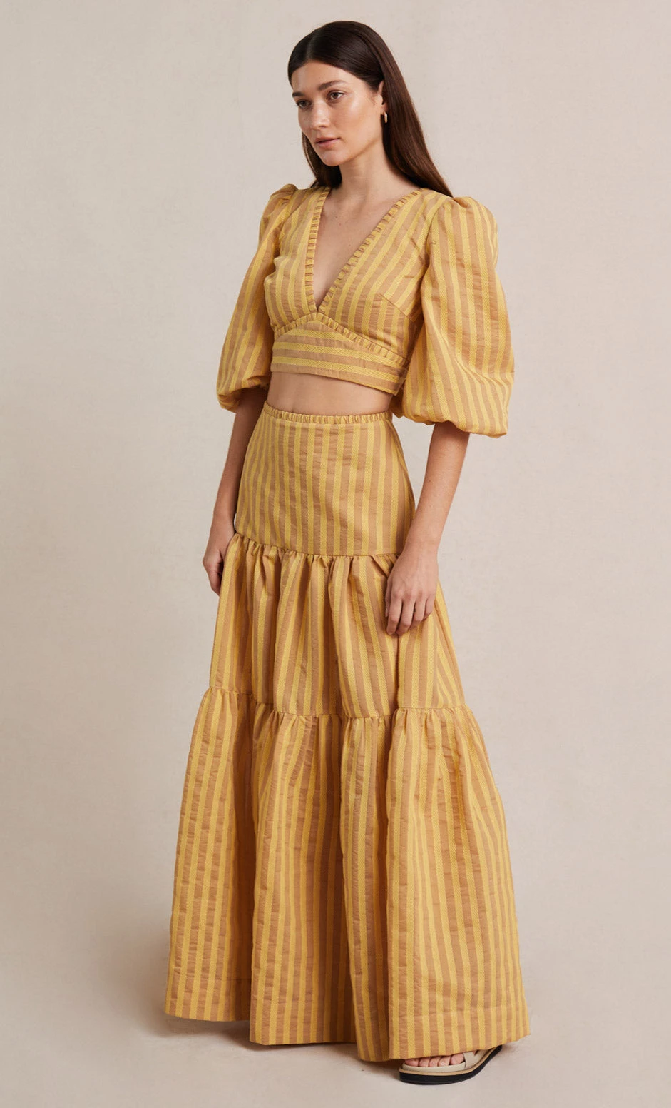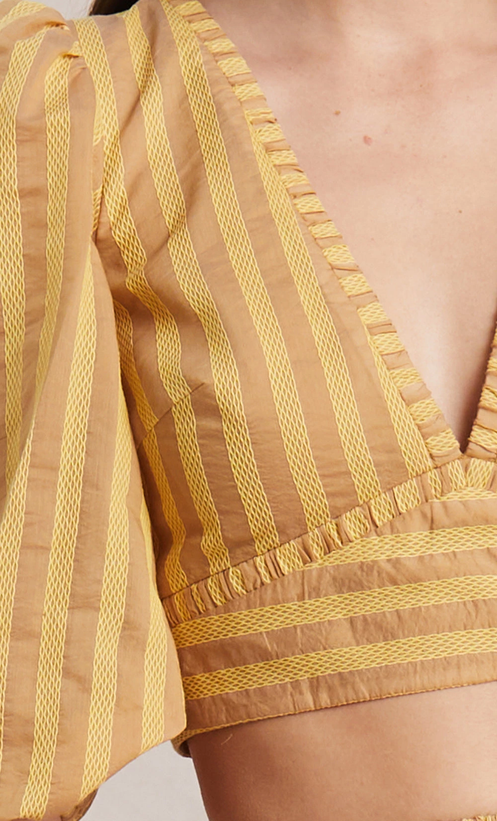 Cut from our signature striped print cotton blend fabric, the breezy Liliana Long Sleeve Top is an easy-to-wear style with a plunge V-neckline finished with an adjustable tie across the open back. The top features voluminous puff sleeves with elasticated cuffs that finish at the elbow. Styled with our Liliana Maxi Skirt.