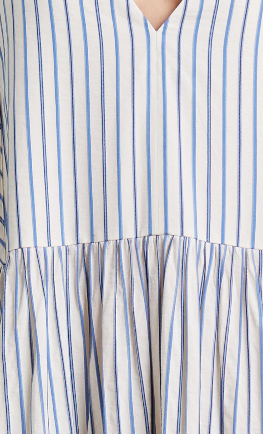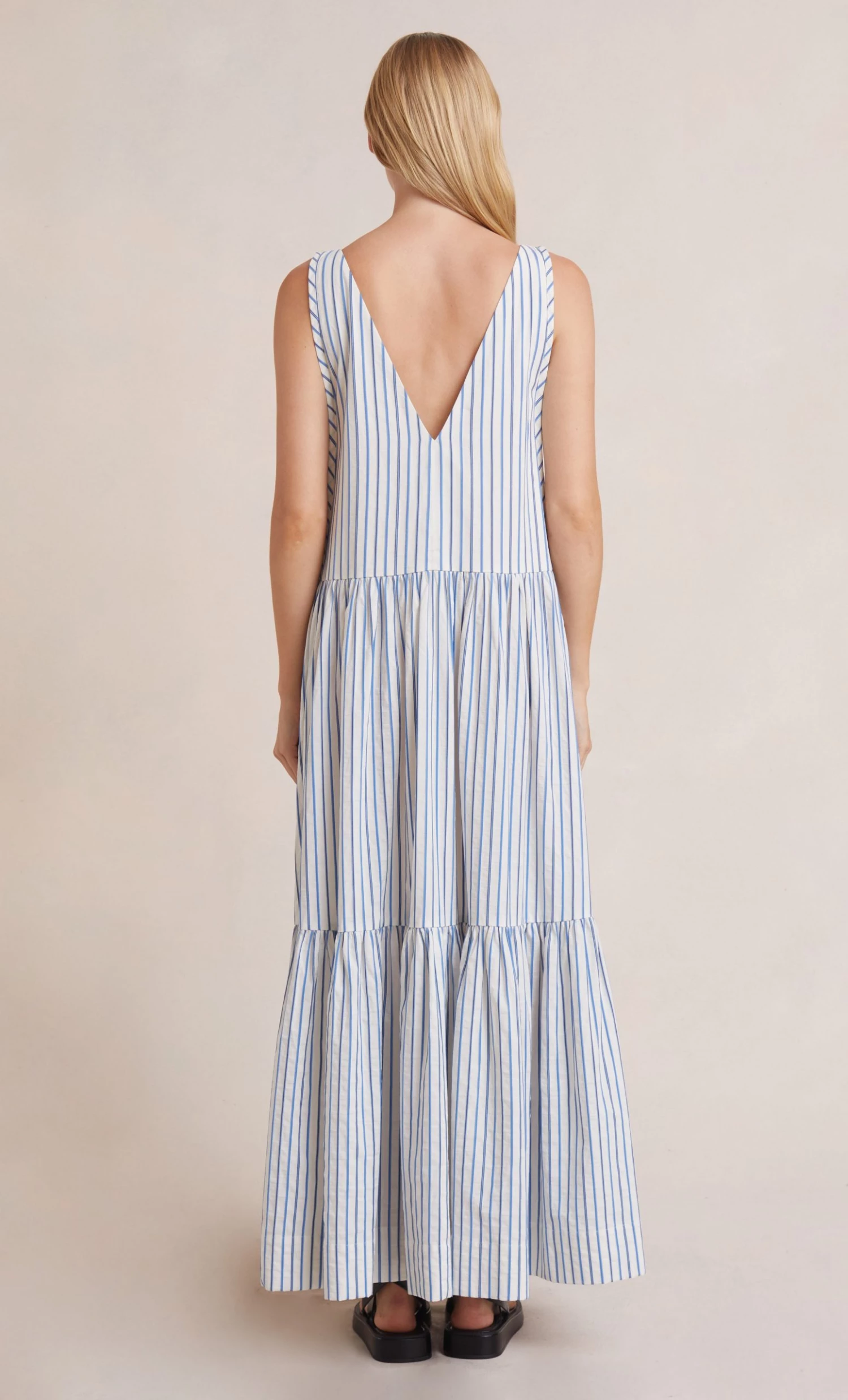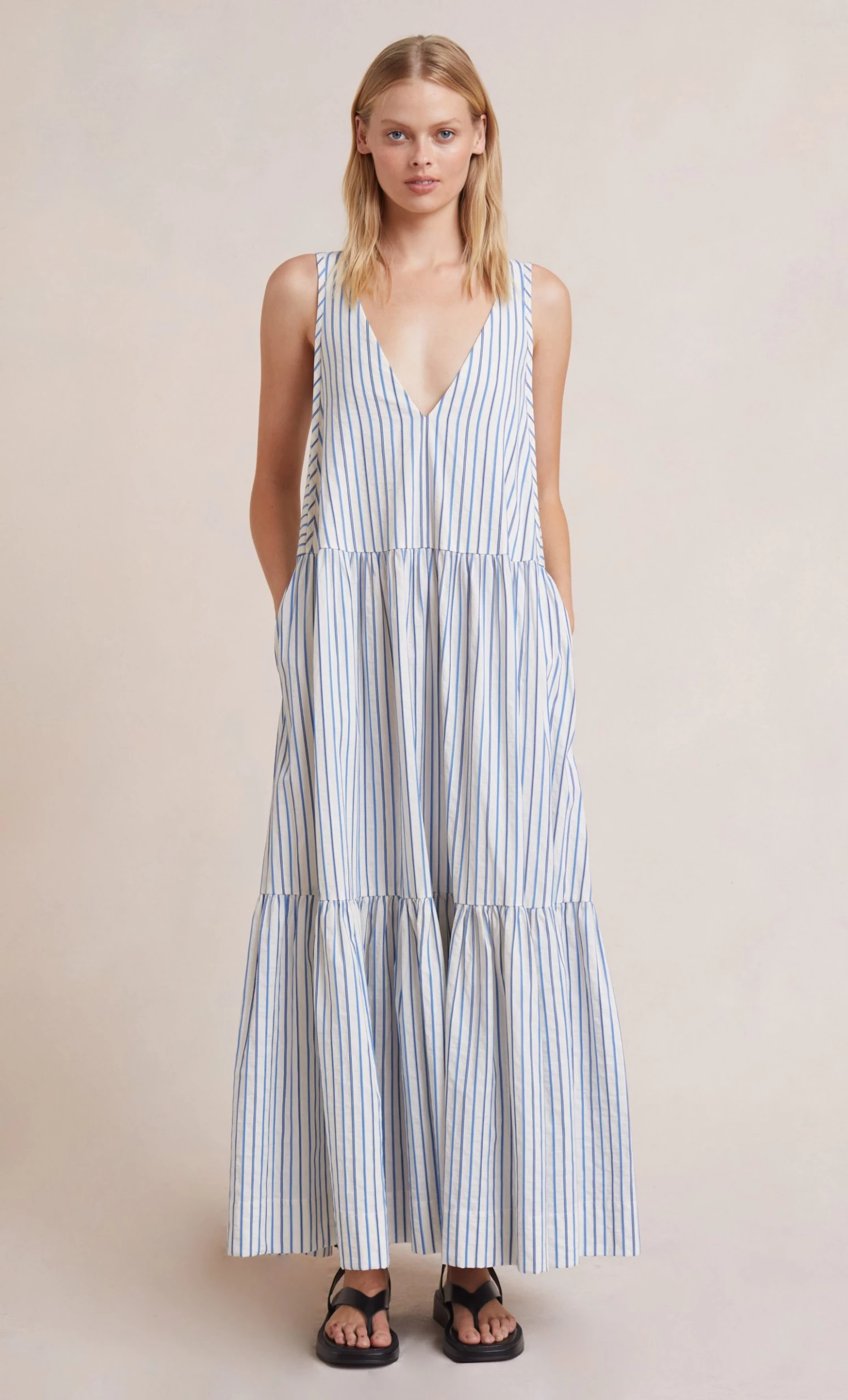 The Lucia Maxi Dress is a relaxed breezy style crafted from a signature striped cotton-blend fabric. The dress features a V-neckline and back with a flowy ankle length skirt.