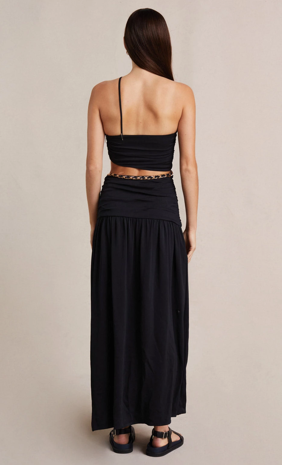 The Modern Romance Dress is a chic statement style with crossbody gold chain detailing that wraps across the waist. The dress features an underbust cut out separating the drop waist skirt to the asymmetrical bandeau and is finished with a single rouleau strap and side leg split.