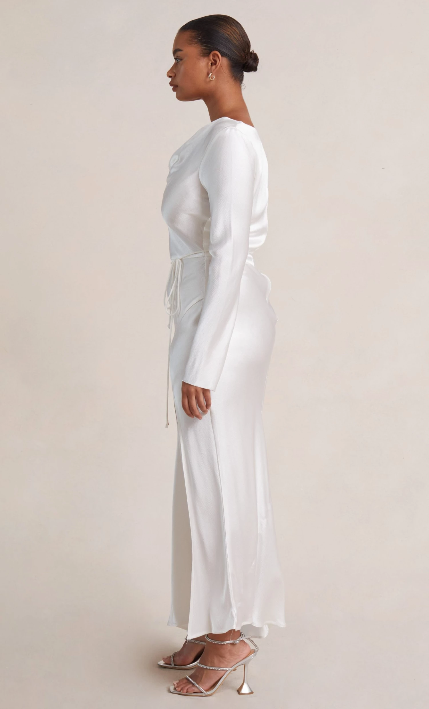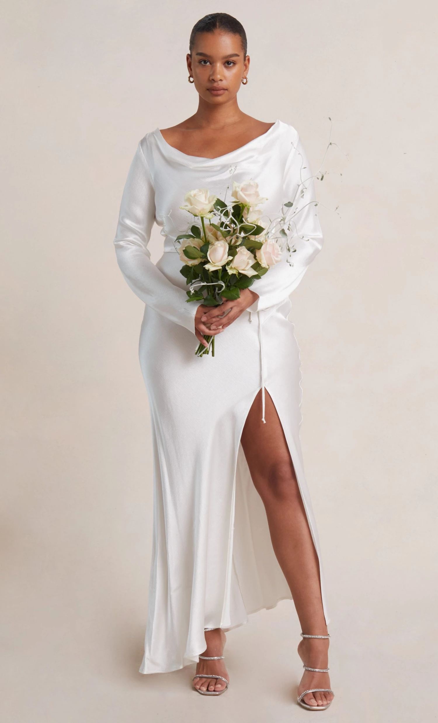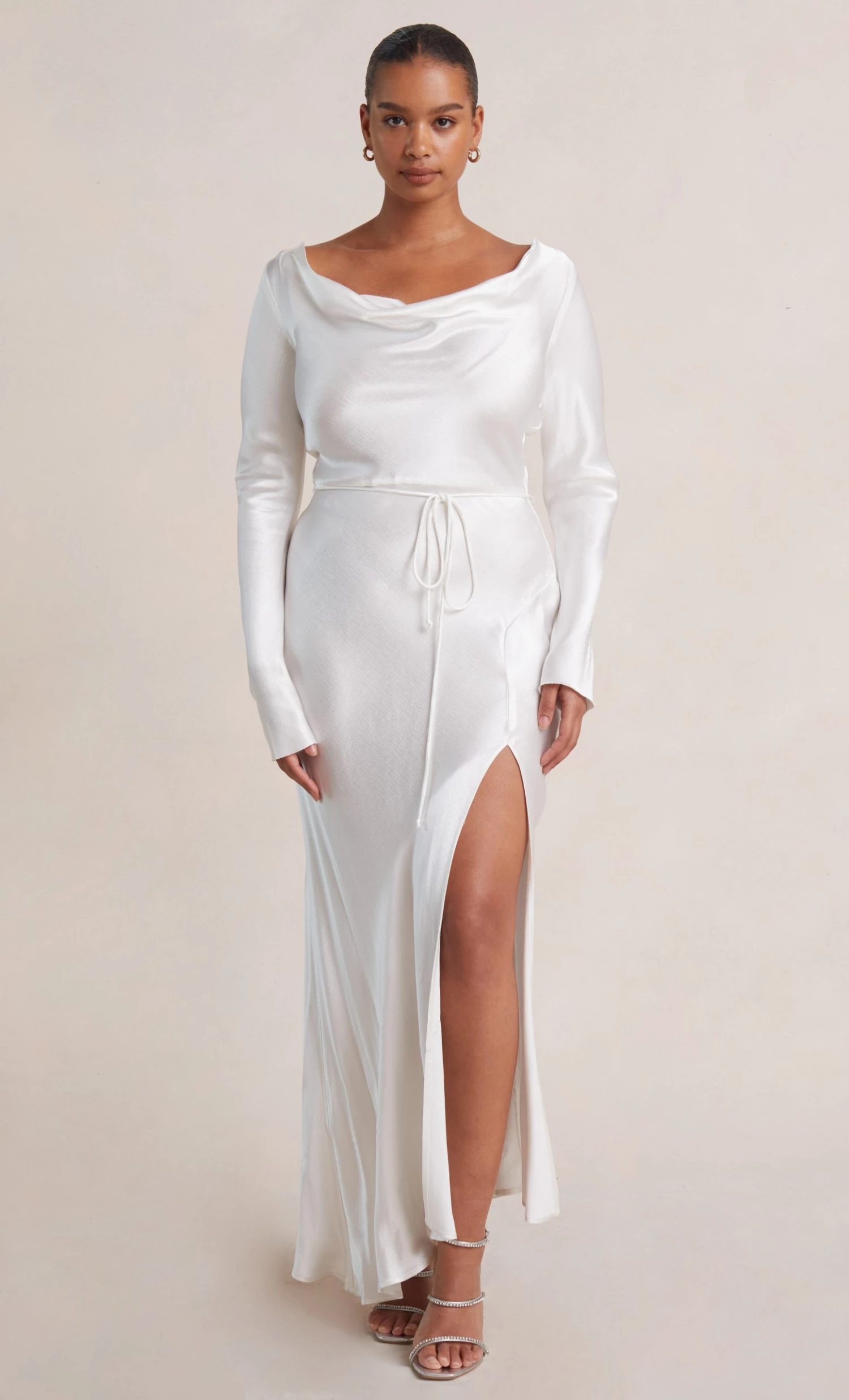 A stylish option for a cool weather wedding, the long sleeve cowl maxi dress is cut on the bias with a cinched tie waist to create a flattering hourglass silhouette. The midi dress features a plunge cowl neckline with a high back, long tapered sleeves, thin rouleau ties and a high leg split in the skirt.