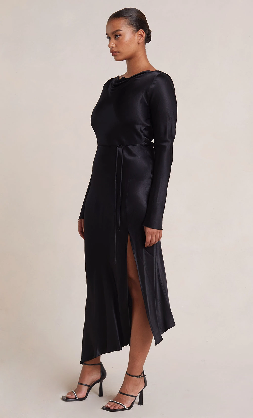 A stylish option for a cool weather wedding, the long sleeve maxi dress is cut on the bias with a cinched tie waist to create a flattering hourglass silhouette. The midi dress features a slight cowl on the high neckline with a low scoop back and leg split in the skirt.