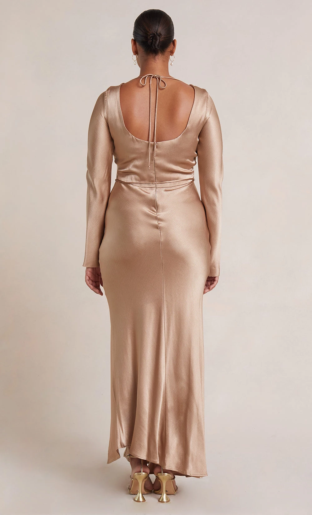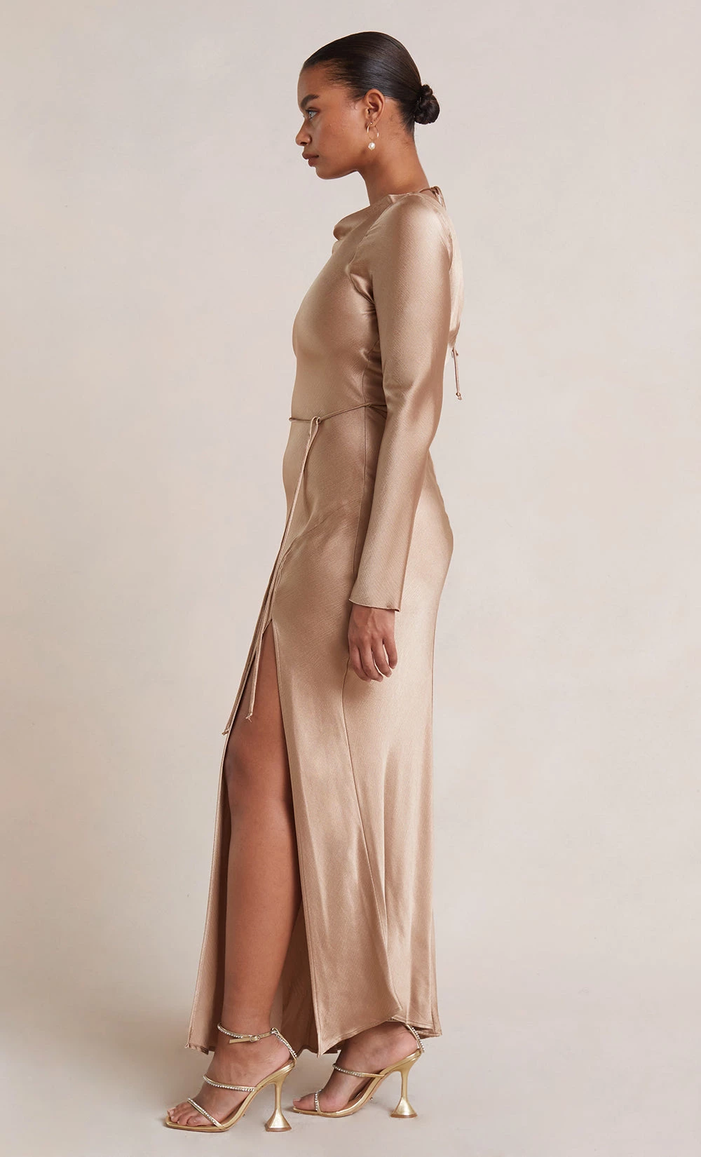 A stylish option for a cool weather wedding, the long sleeve maxi dress is cut on the bias with a cinched tie waist to create a flattering hourglass silhouette. The midi dress features a slight cowl on the high neckline with a low scoop back and leg split in the skirt.