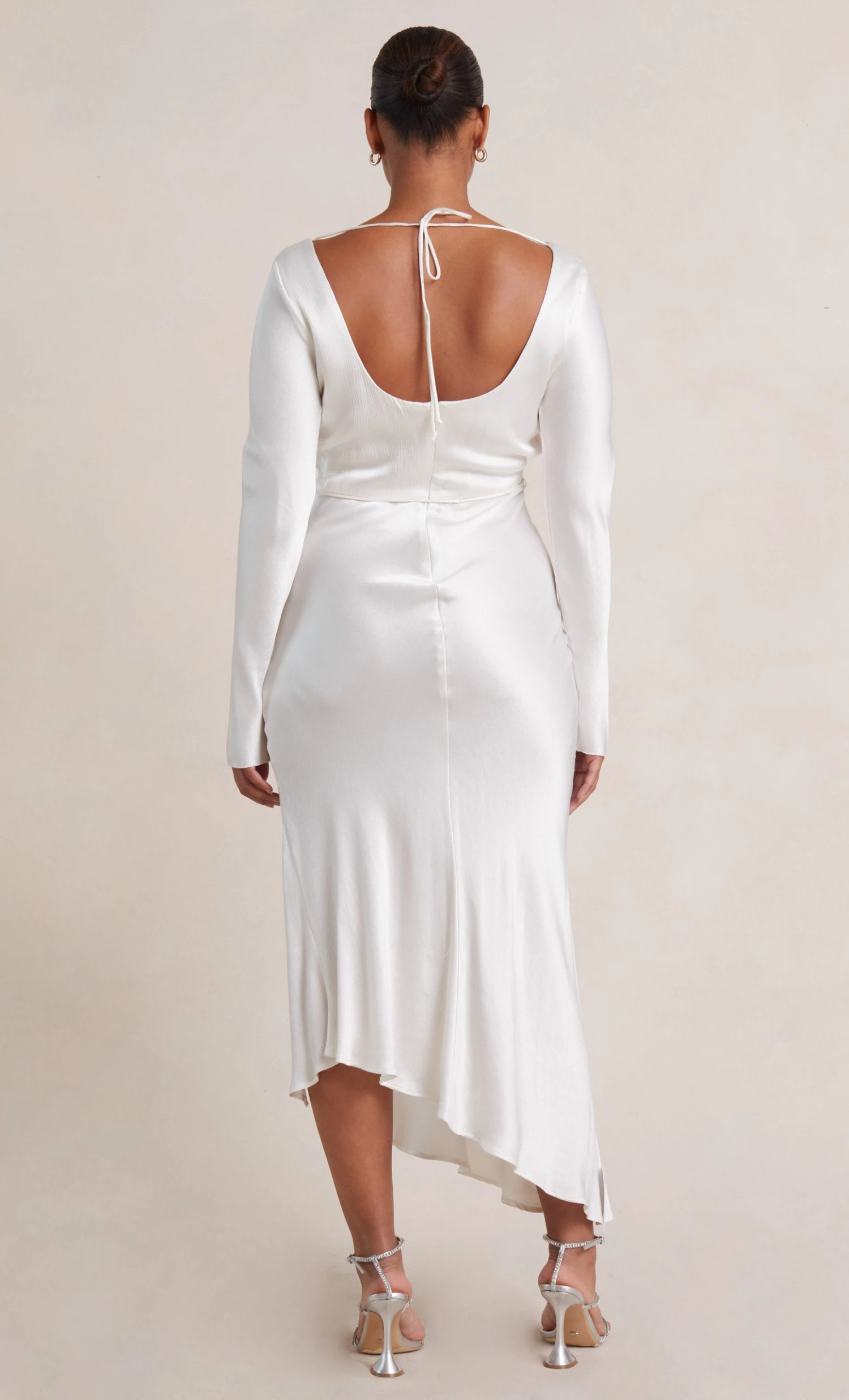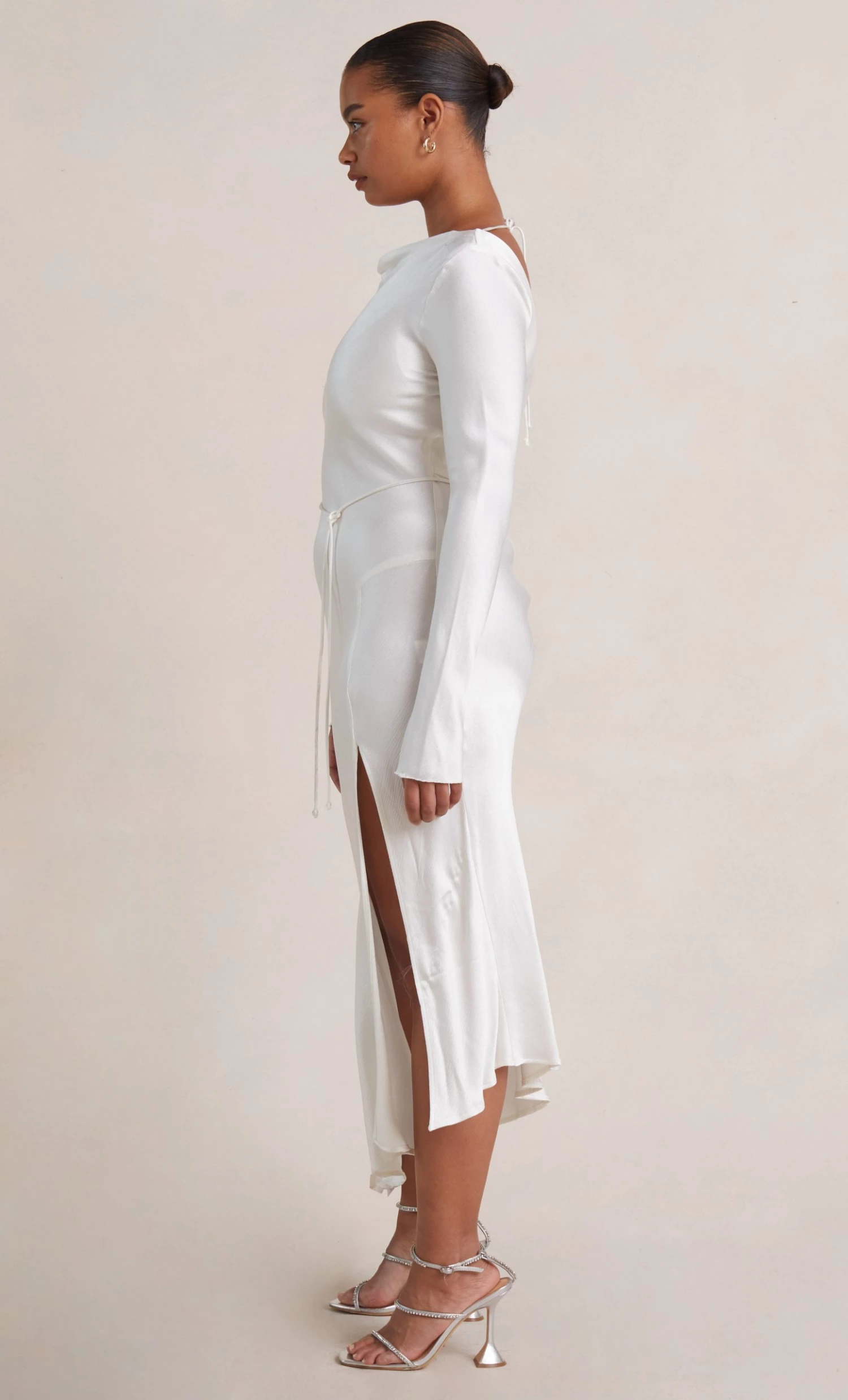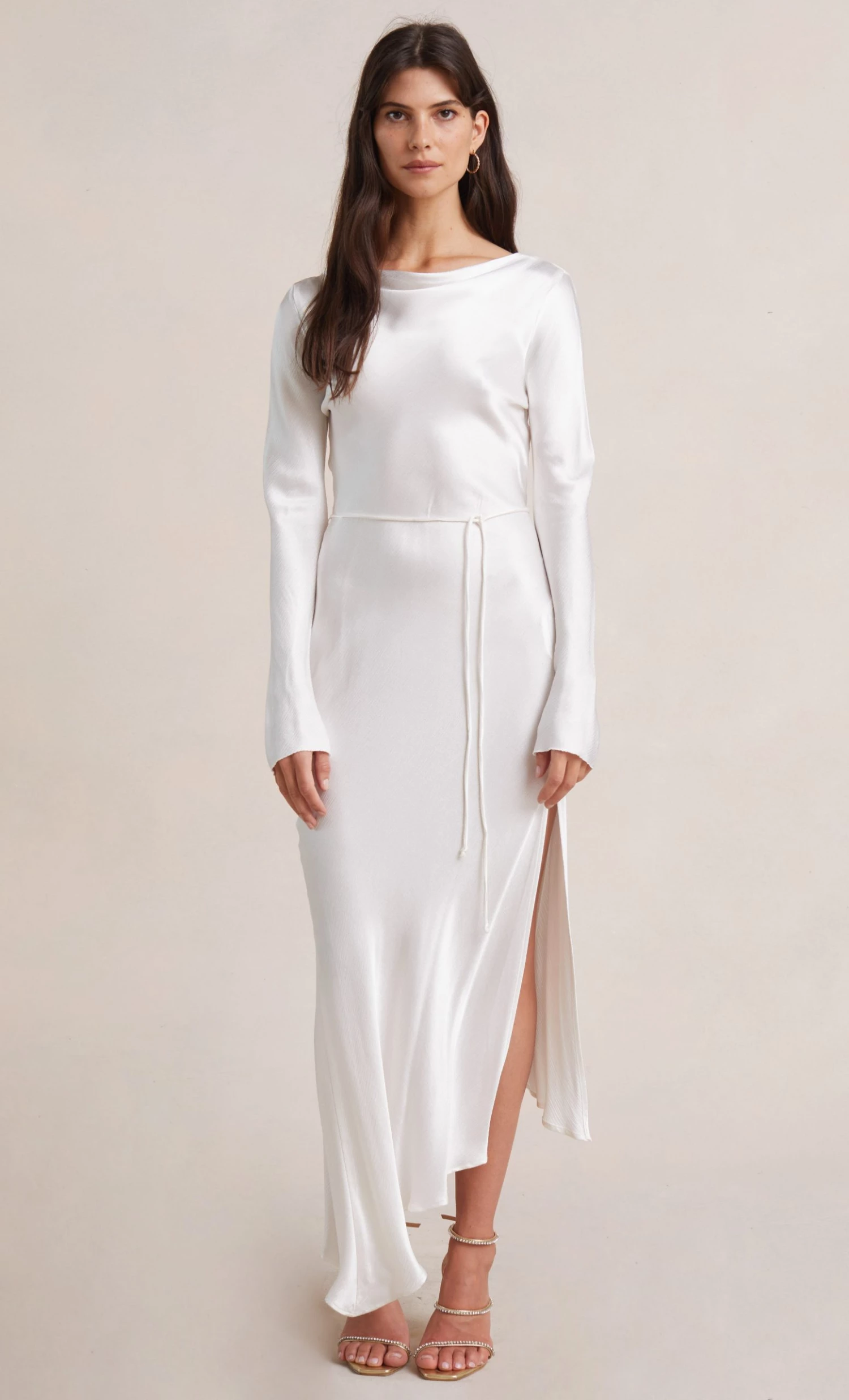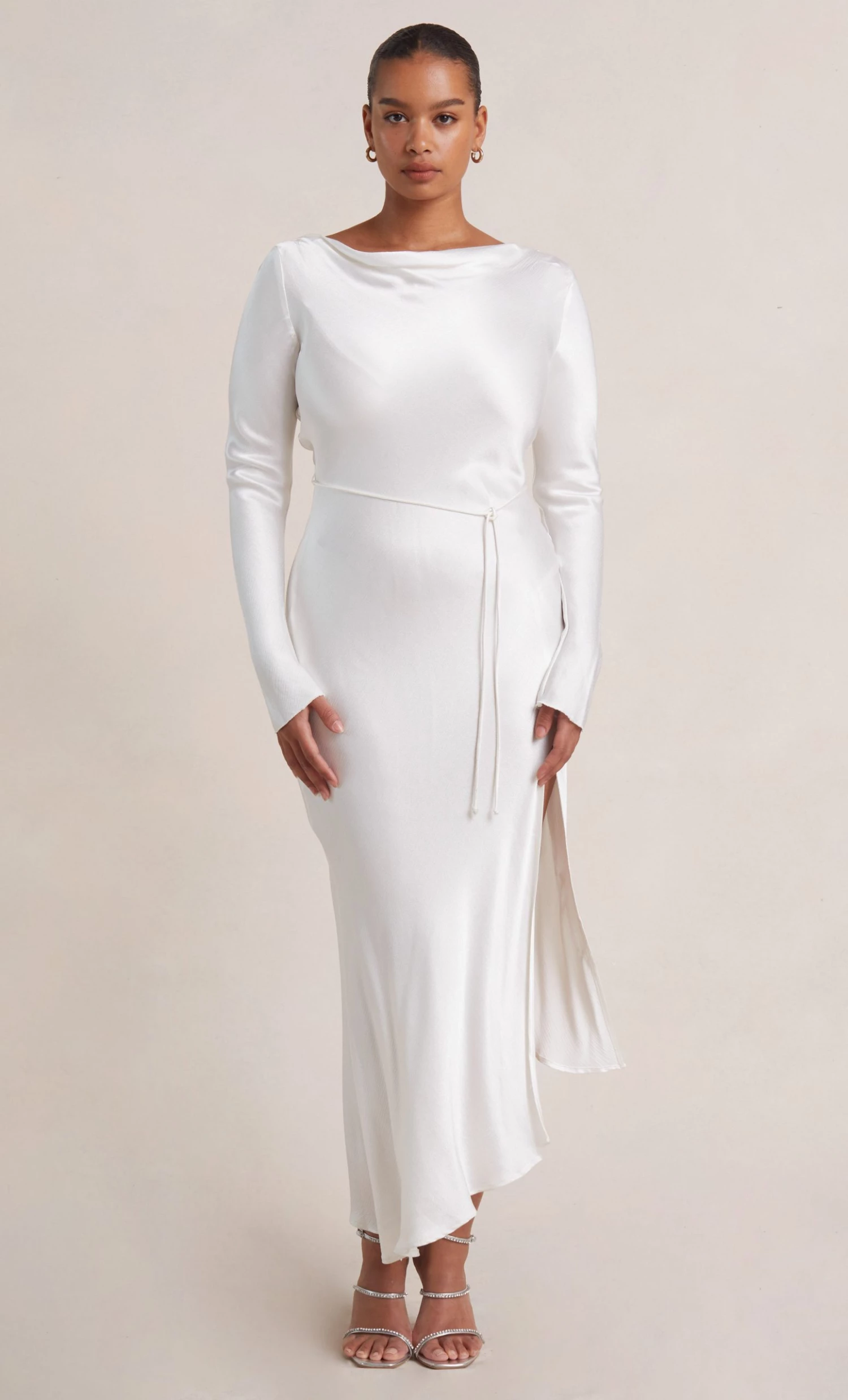 A stylish option for a cool weather wedding, the long sleeve maxi dress is cut on the bias with a cinched tie waist to create a flattering hourglass silhouette. The midi dress features a slight cowl on the high neckline with a low scoop back and leg split in the skirt.
