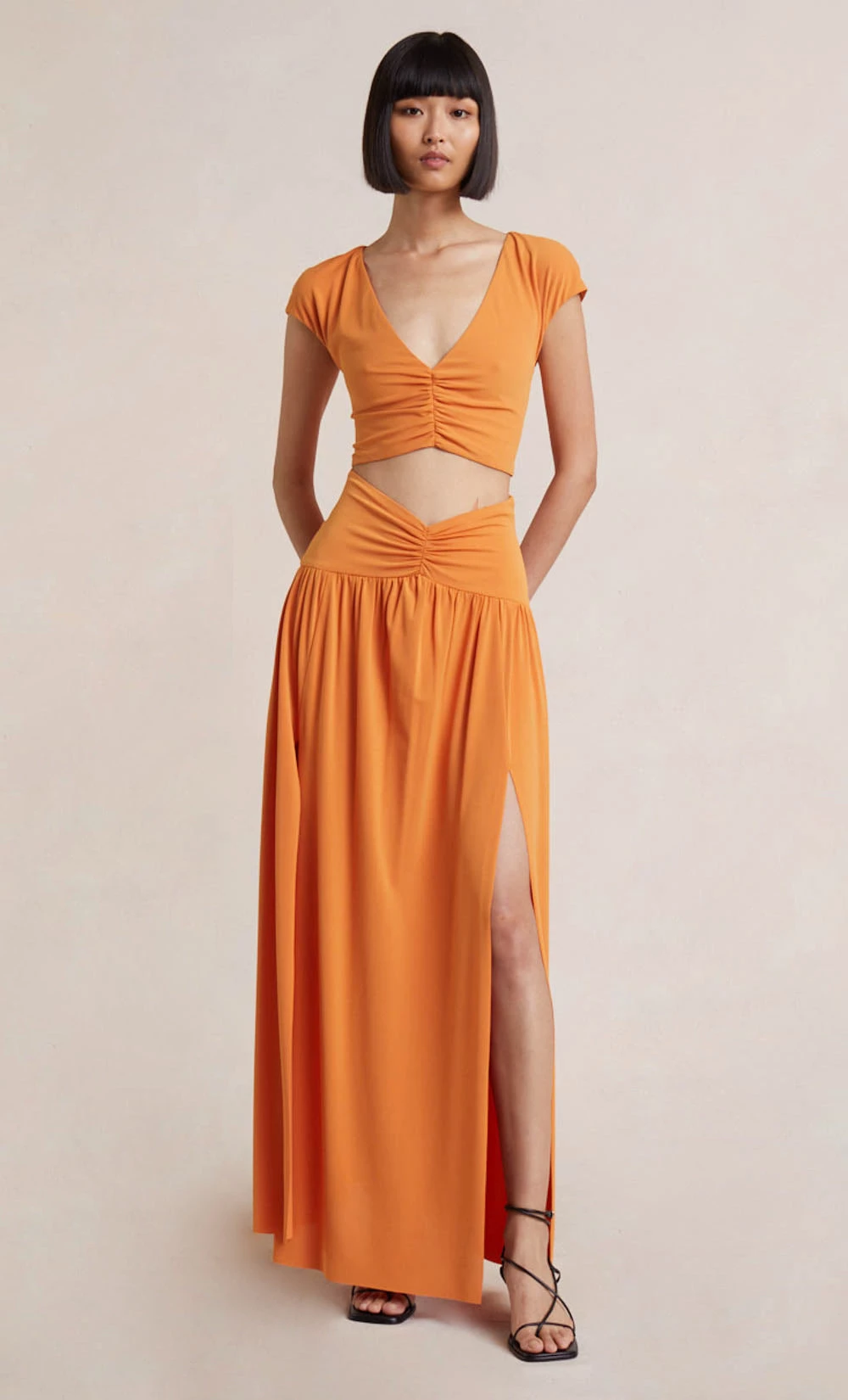 The Myla Maxi Skirt is cut from our signature liquid crepe fabric that skims the silhouette. This event wear style features a gathered, drop waist that flows into a voluminous maxi skirt and is finished with a front leg split. Styled with our Myla Top.