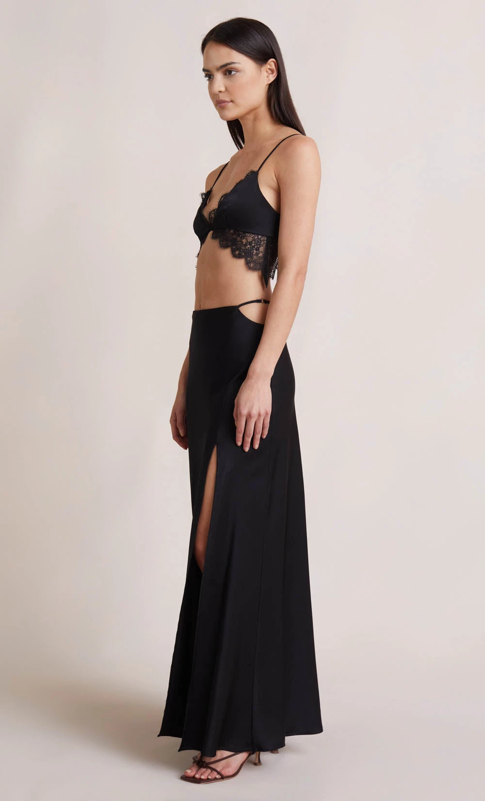 Make an entrance in the Camille Top. The statement bralette, featuring classic triangle cups, is finished with fine lace detailing, thin rouleau straps and contrasting E-hook hardware. Styled with our Camille Skirt.