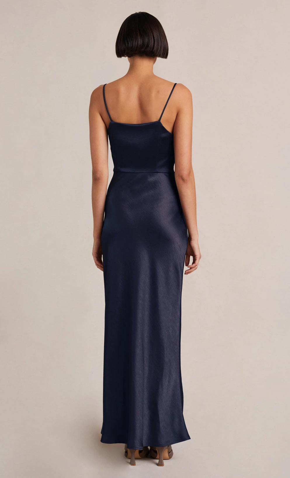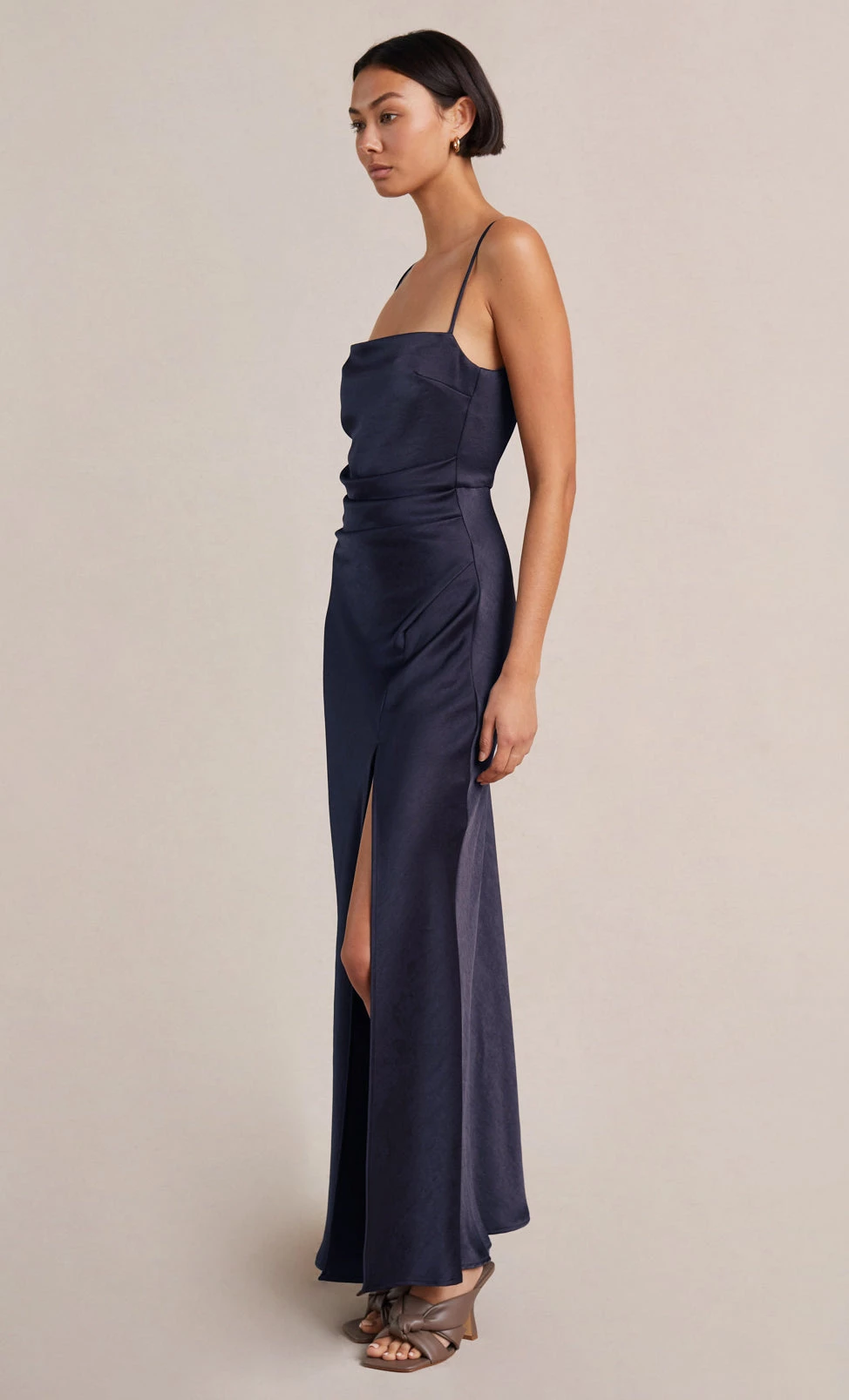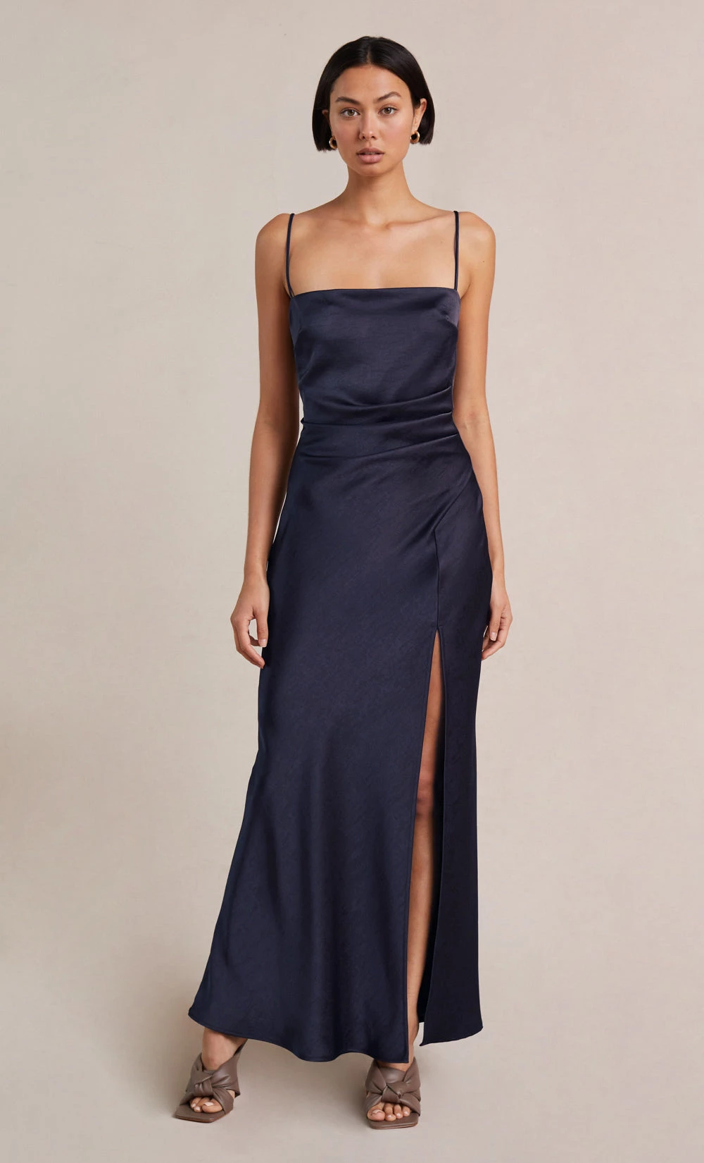 The Nadia Maxi Dress is a flattering bias cut event wear style with a gathered detailing at the waist that disguises any unwanted shapes on the stomach. The maxi Dress features a straight neckline with a fitted bust, rouleau straps, and a relaxed flowy skirt with a front split hem.
