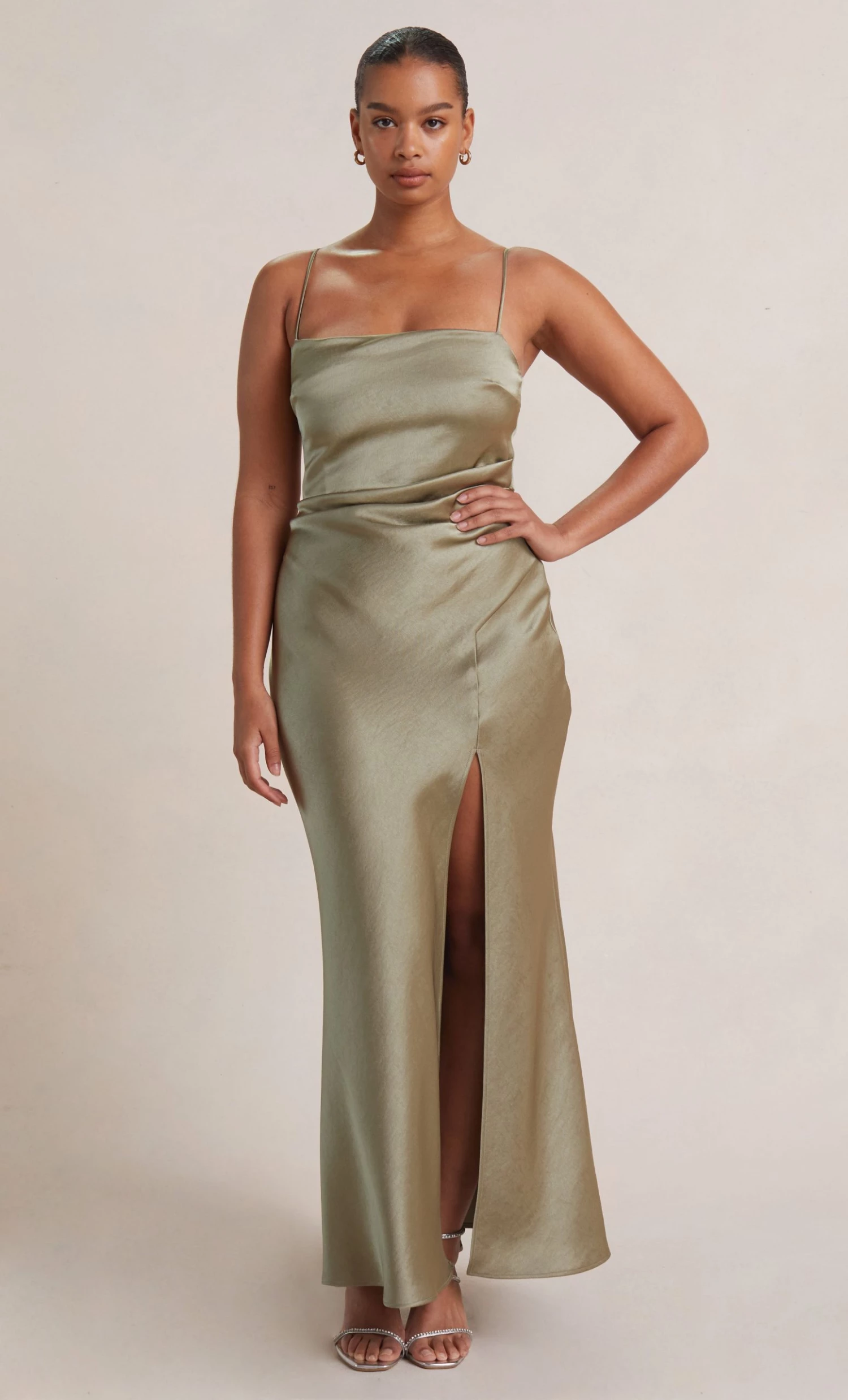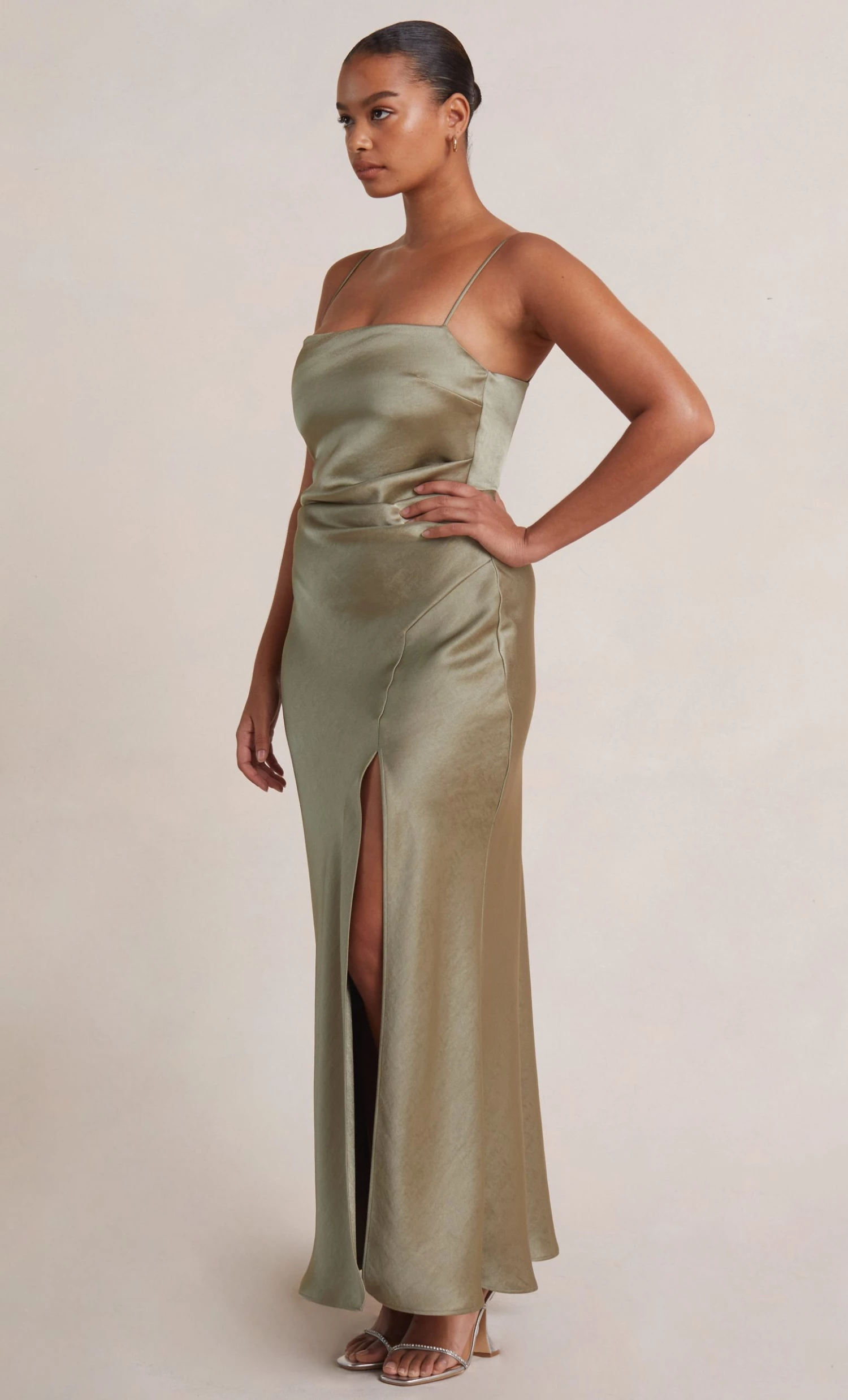 The Nadia Maxi Dress is a flattering bias cut event wear style with a gathered detailing at the waist that disguises any unwanted shapes on the stomach. The maxi Dress features a straight neckline with a fitted bust, rouleau straps, and a relaxed flowy skirt with a front split hem.