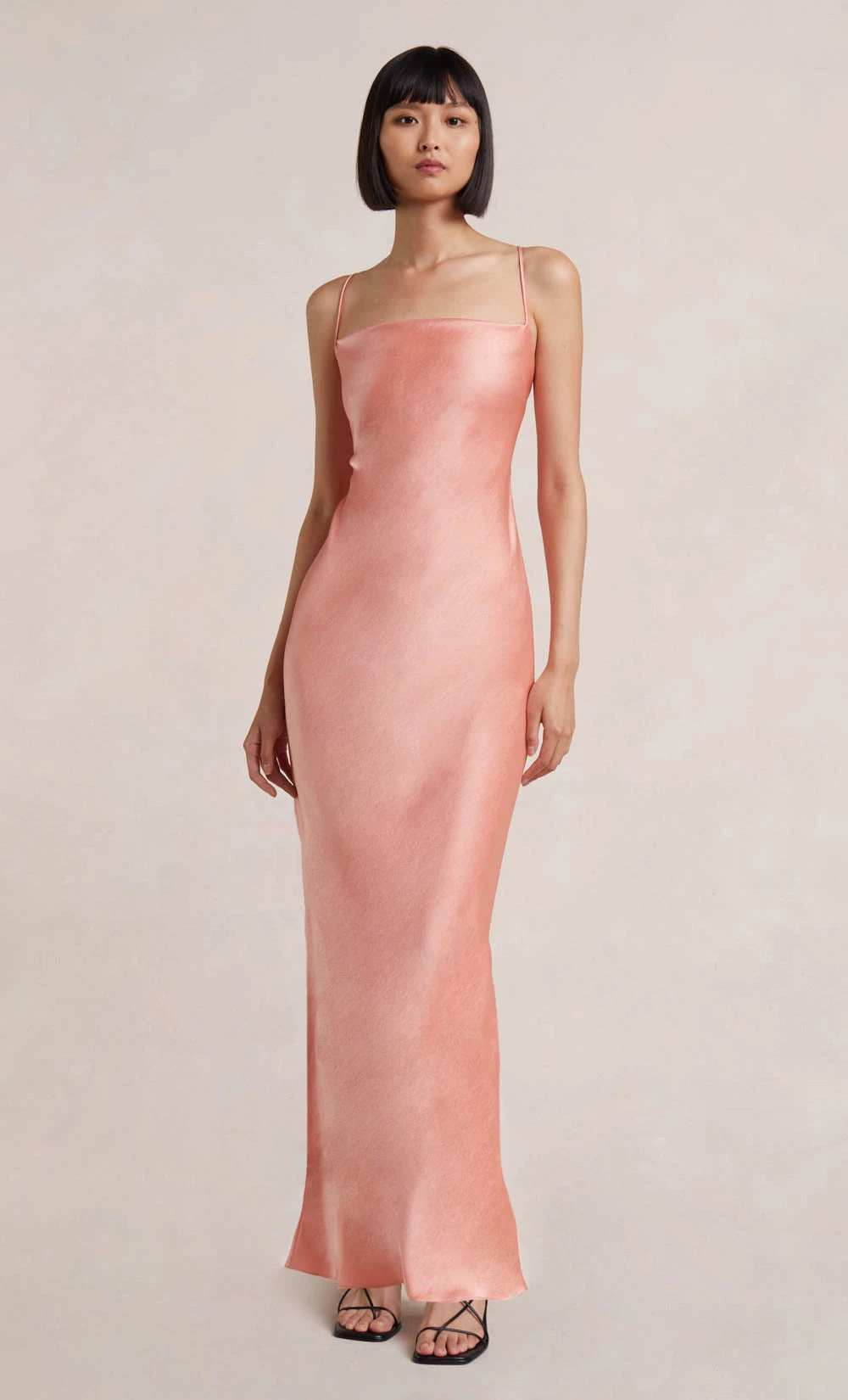 Cowl neck maxi dress with a low square back featuring an adjustable tie detail.