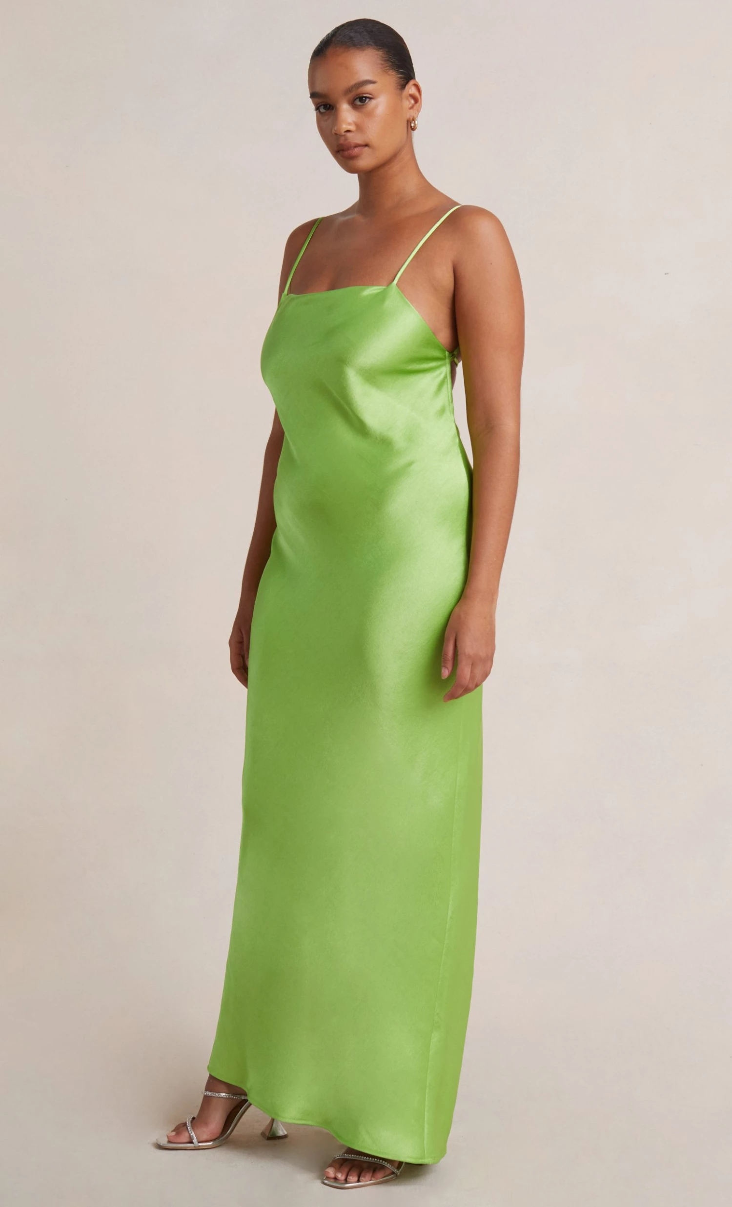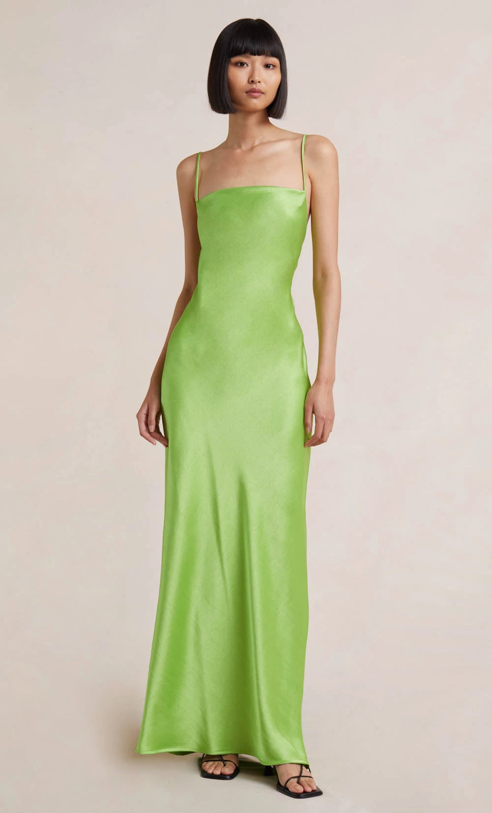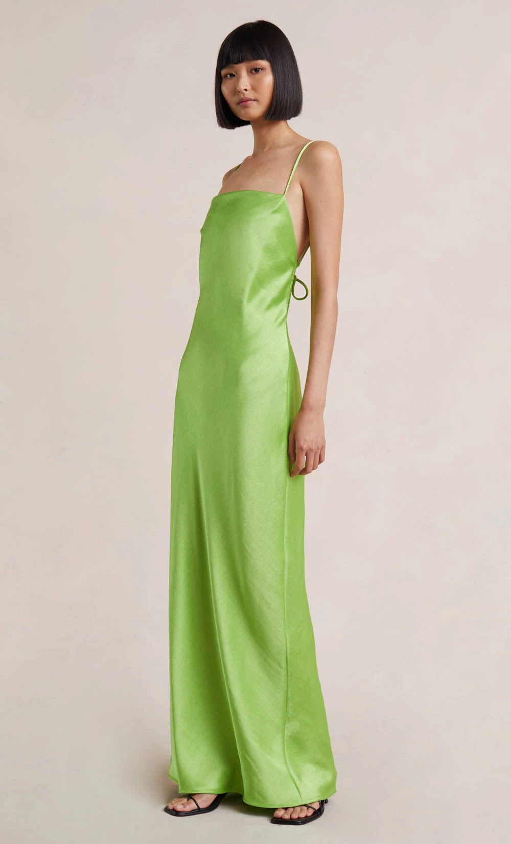 Cowl neck maxi dress with a low square back featuring an adjustable tie detail.