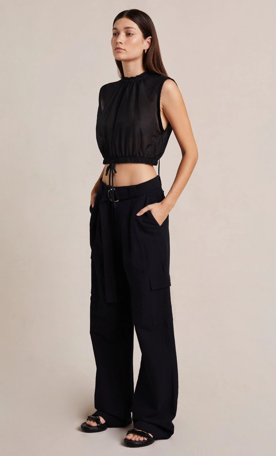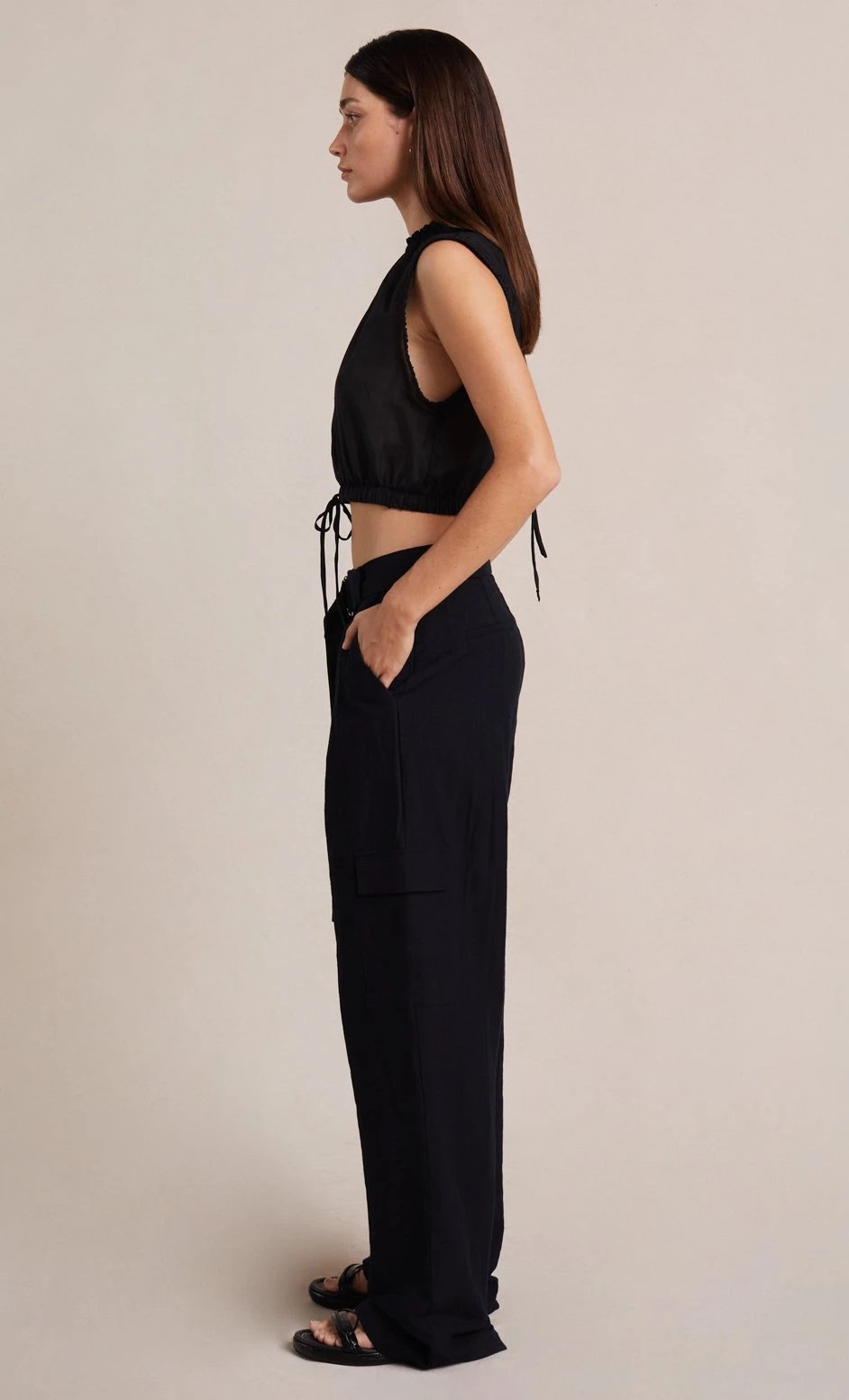 Cut from a lightweight cotton blend fabric, the Papillon Top is a cropped and sleeveless style with an elasticated hemline on the high waist. A flexible style, the top is reversible and can be worn with the plunging keyhole cut out on the bust or worn on the back for more coverage. The top is finished with strappy adjustable ties on the keyhole cutout and on the hemline. Styled with our Fletcher Pant.