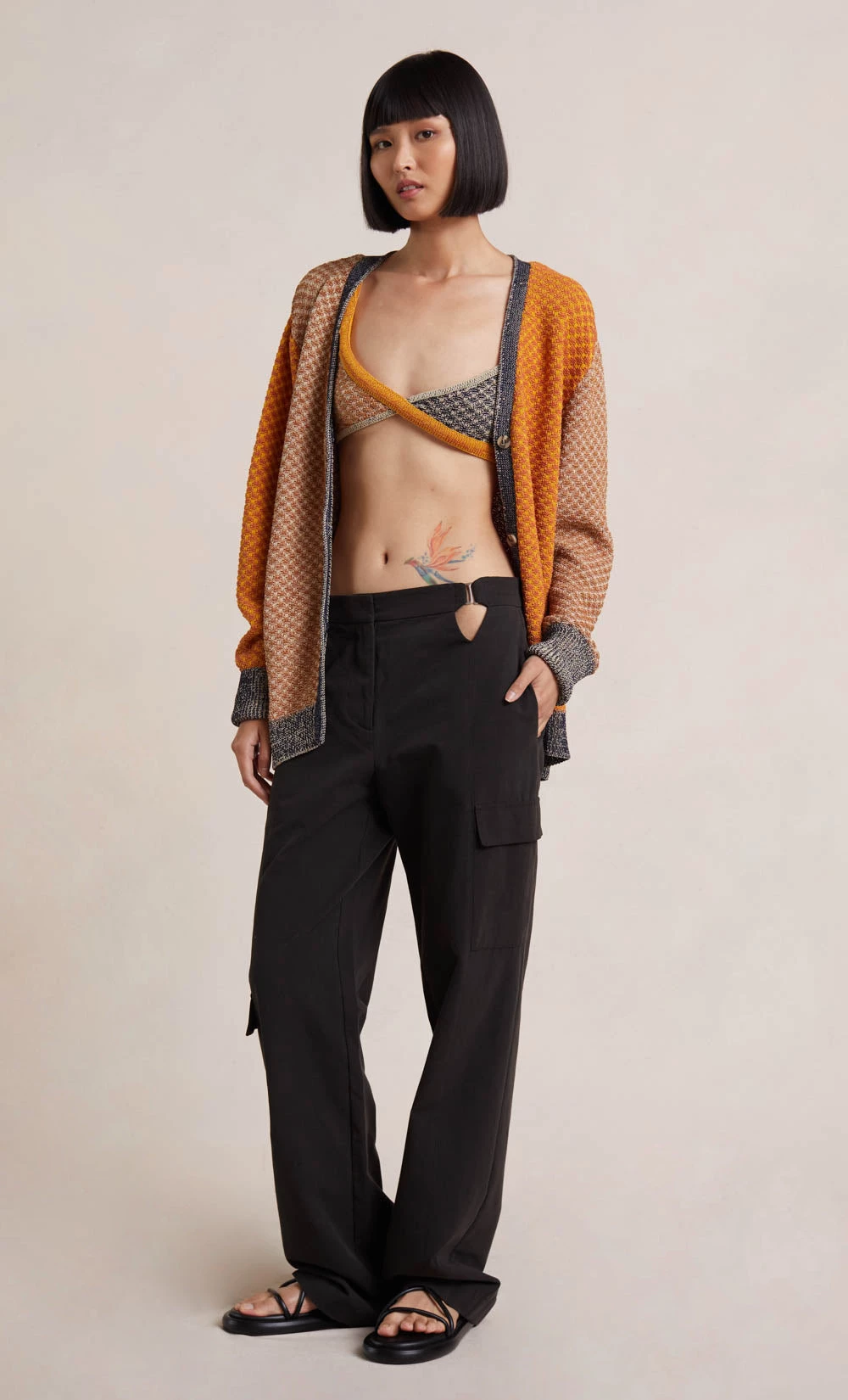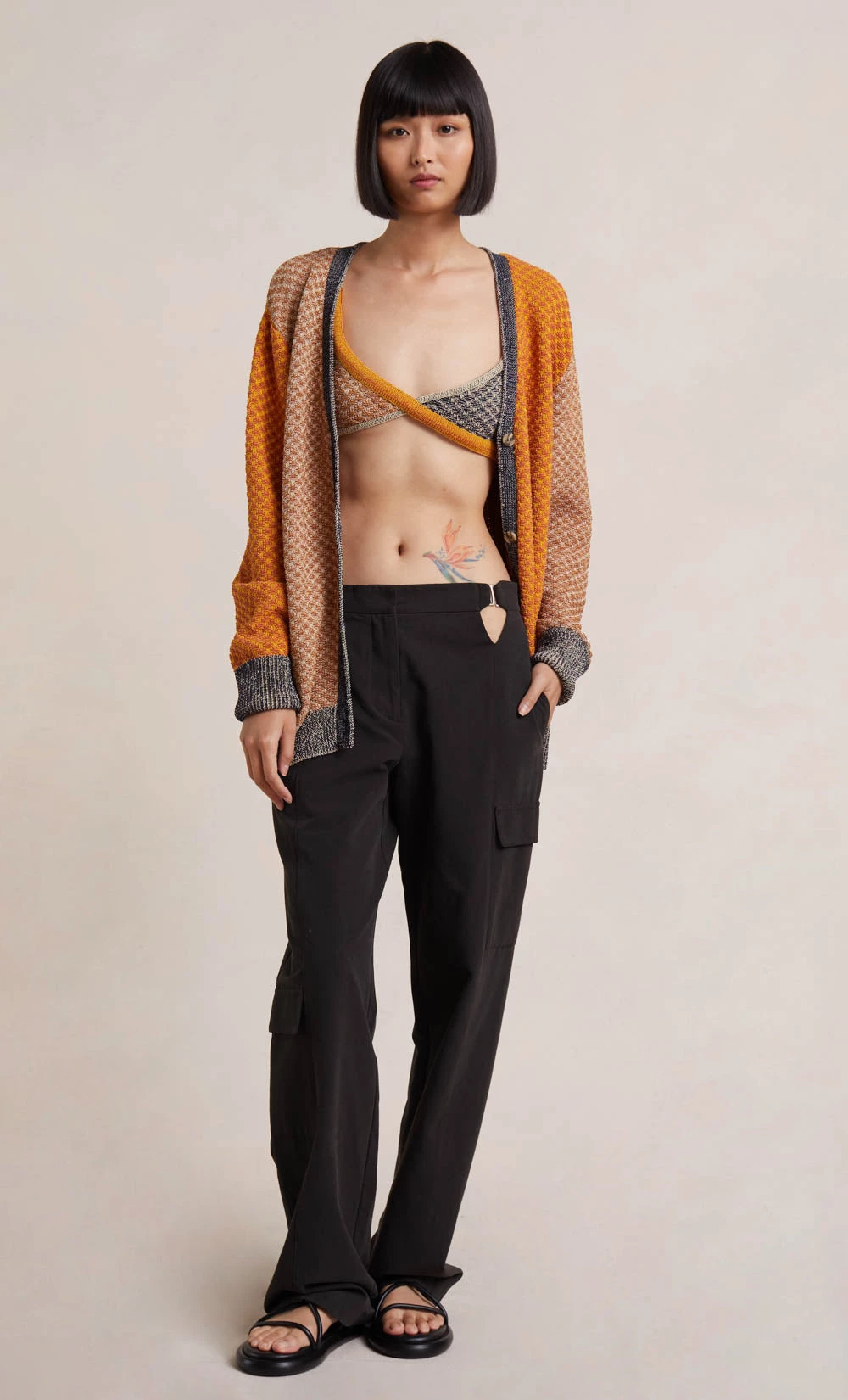 The Patchwork Cardigan is cut from a two-tone knit fabric. This statement cardigan features a contrast design with a ribbed cuff and hem in a relaxed silhouette. The cardigan is finished with a tortoiseshell button front placket. Styled with our Matching Patchwork Knit Bra and Claude Pant.