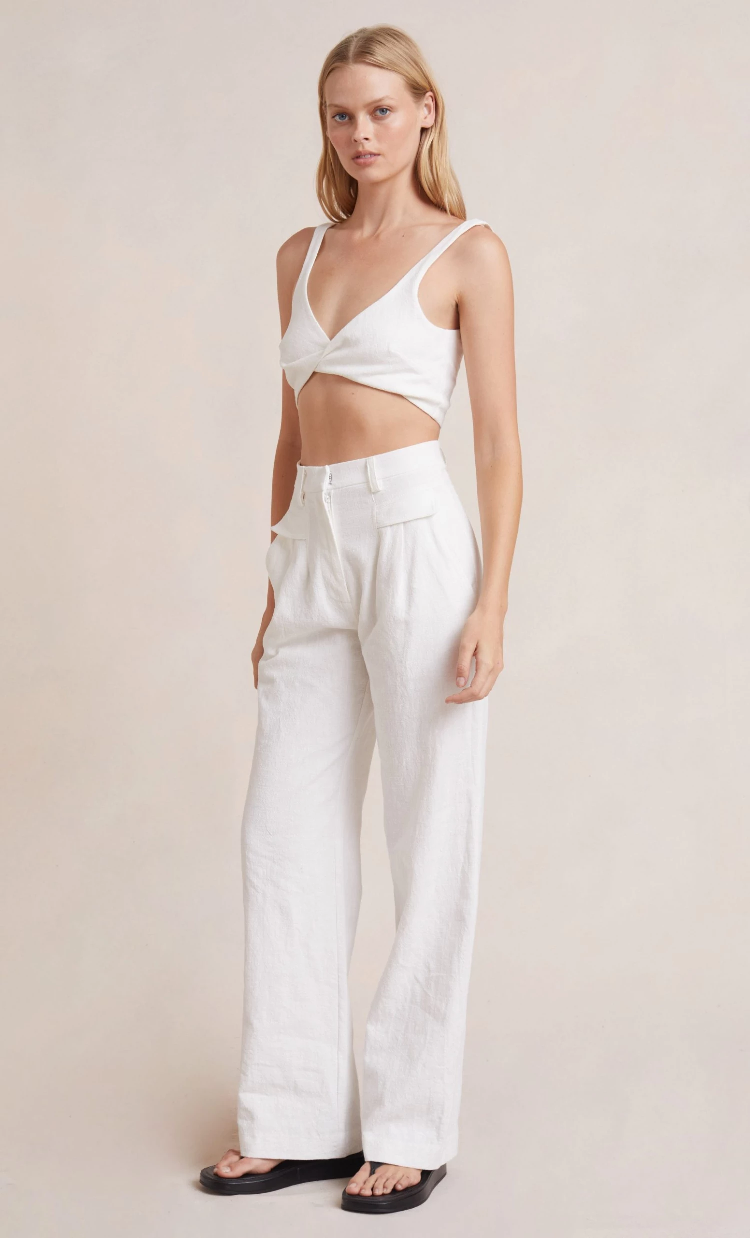 A short and sweet cropped style, the Phoebe Top features a twist-front V-neckline with wide shoulder straps. The top is finished with a low scoop backline and a zipper at the back.