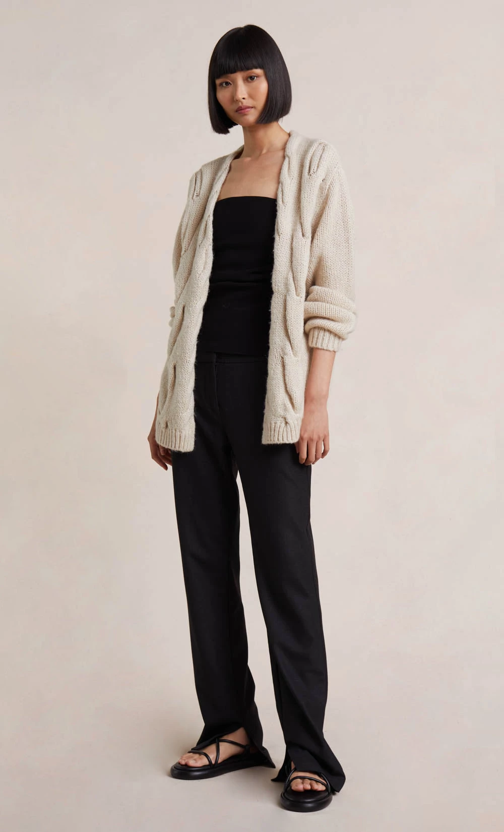A cosy and versatile wardrobe essential, the Romania Knit Cardigan is a soft knit design cut in an oversized silhouette. A long-sleeved style to be worn open, the cable-knit cardigan features a stylish ribbed sleeve cuff, collar and hem. Styled with our Adele Bodice and Lee Pant.