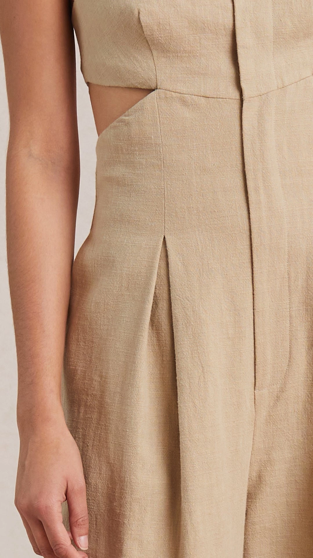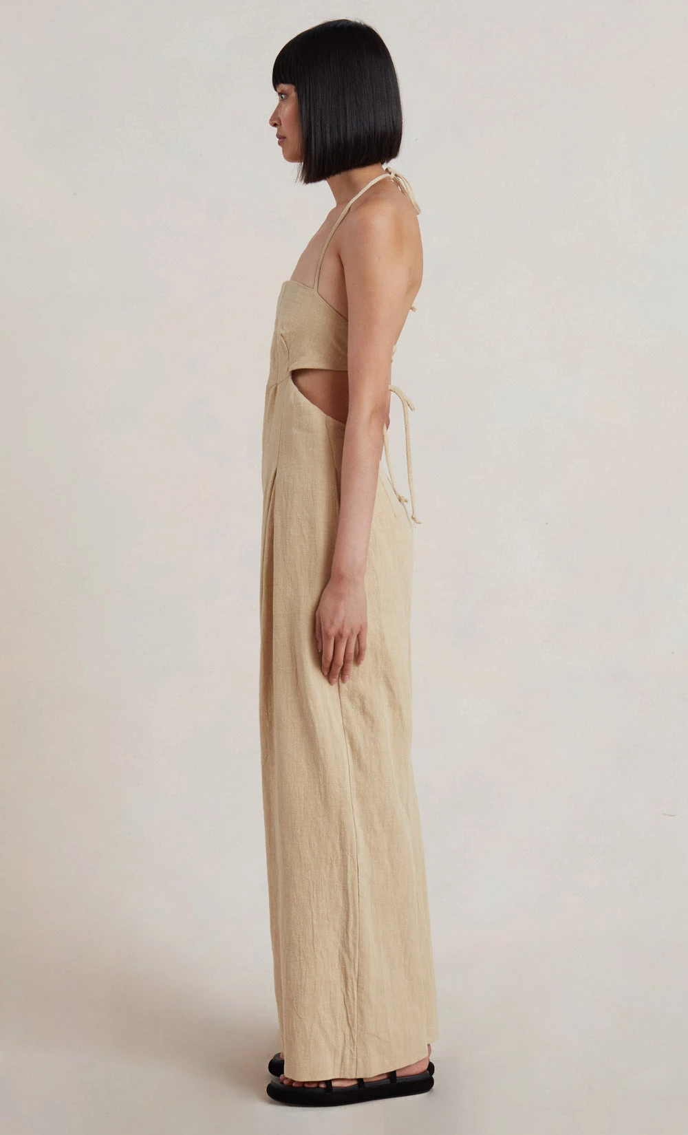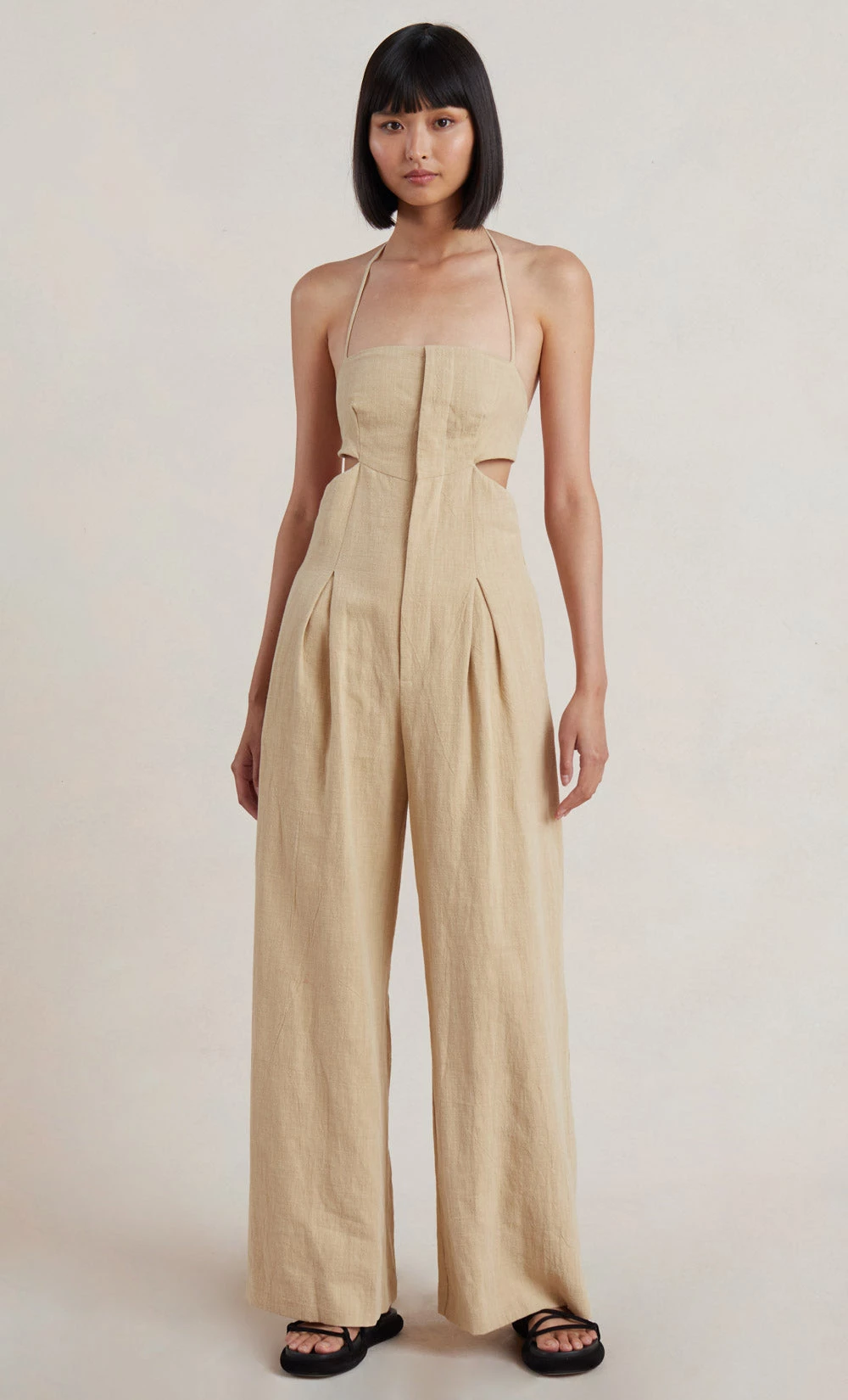 The effortless Monty Jumpsuit is cut from a woven fabric in a wide leg silhouette. The jumpsuit features a straight neckline with a fitted bodice that leads to a statement waist cutout, front placket, pleated details and front slant pockets.