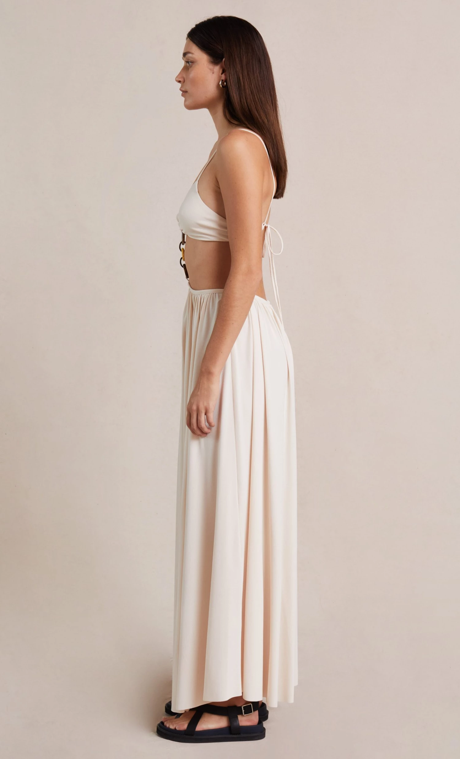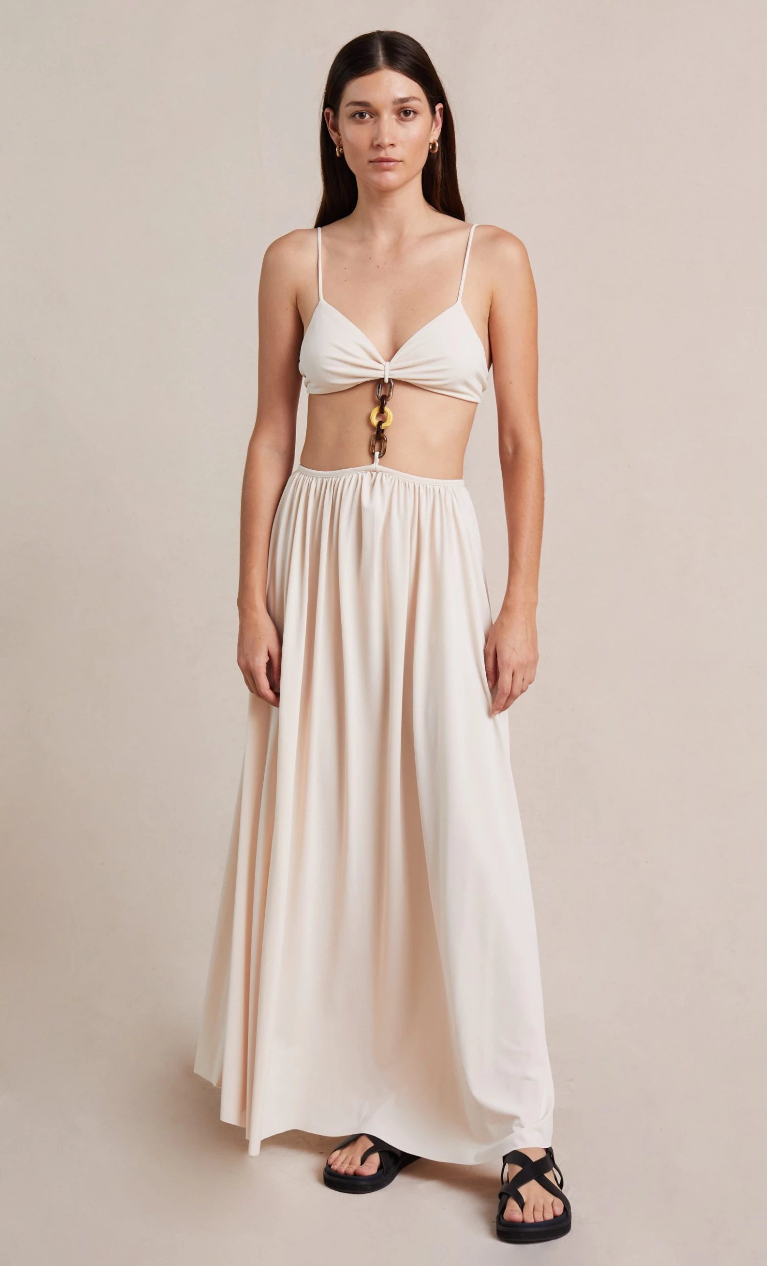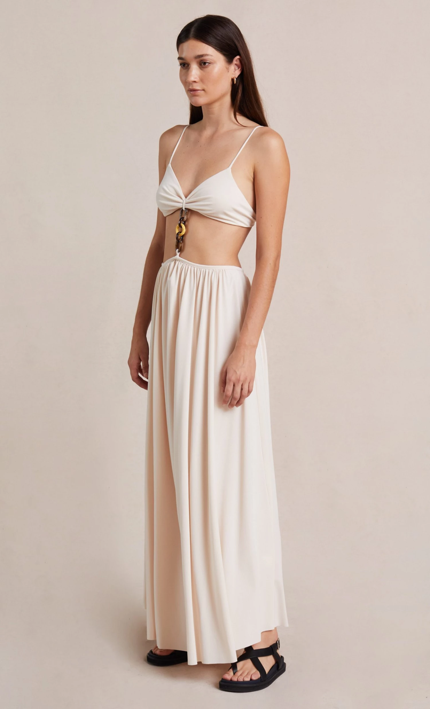Sway in with a statement look in the Soleil Maxi Dress. This easy-to-wear style is crafted from a soft crepe knit fabric and features a gathered triangle bust, accented by a resin chain detail and a flowy maxi length skirt.