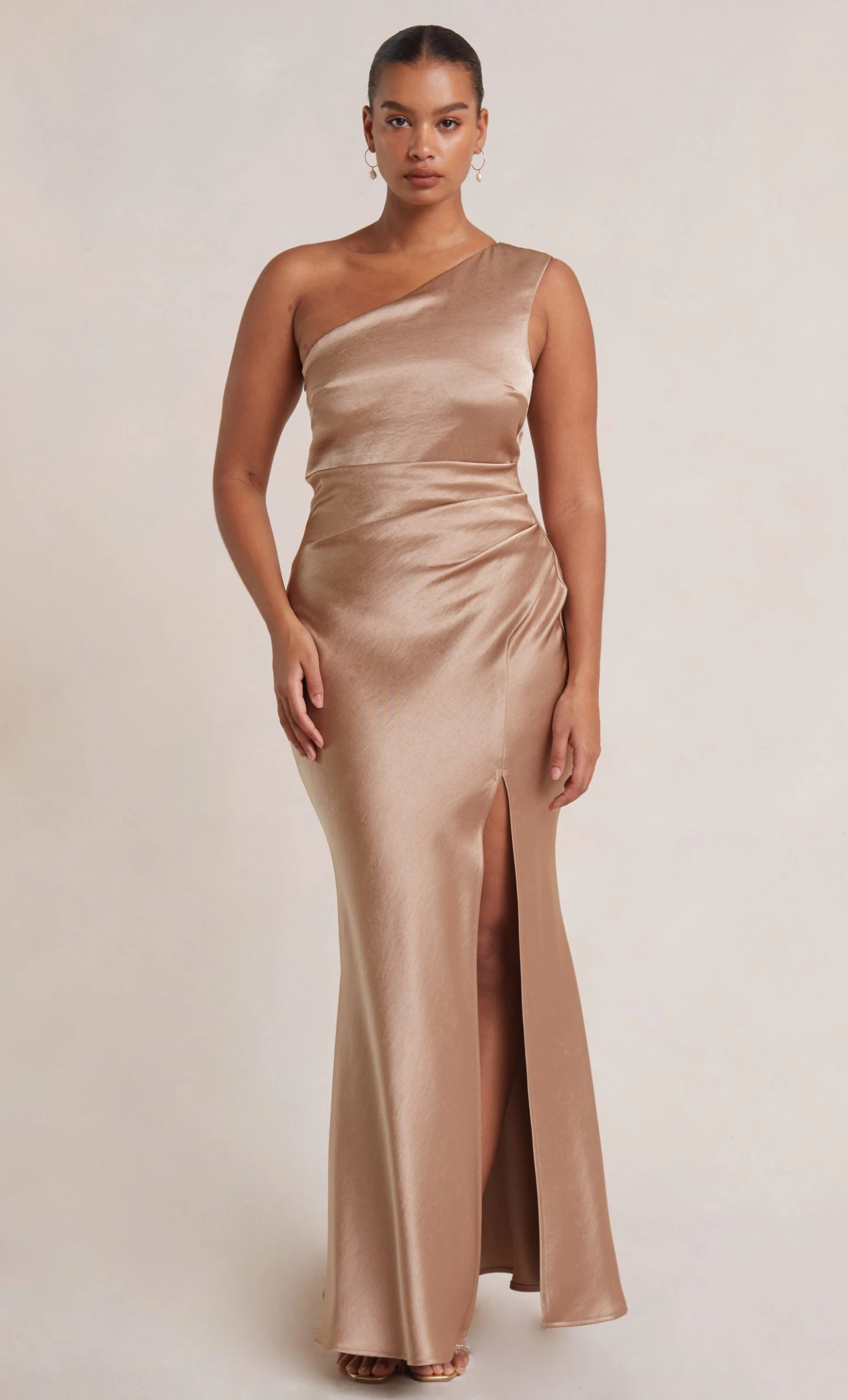 Flattering one shoulder maxi dress with asymmetrical neckline, side tuck detailing over the hips and waist, and a statement leg split.