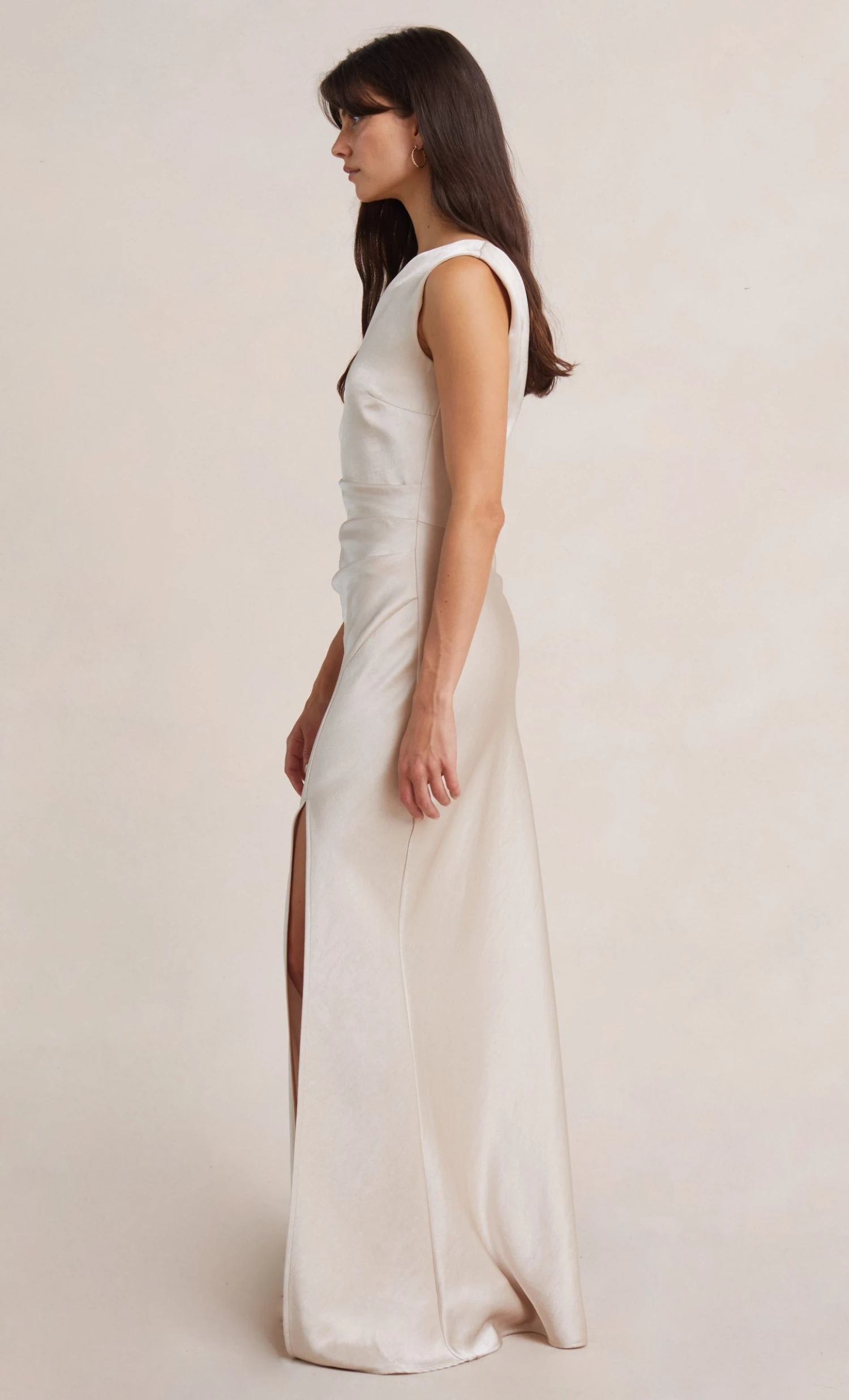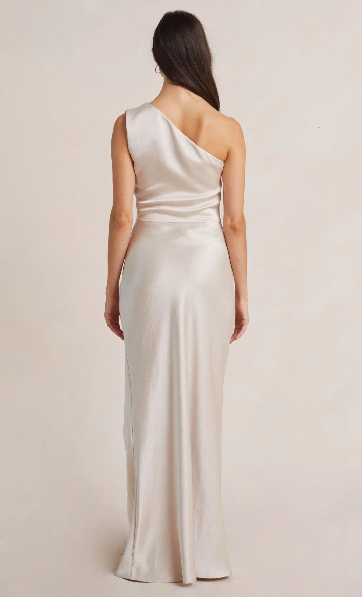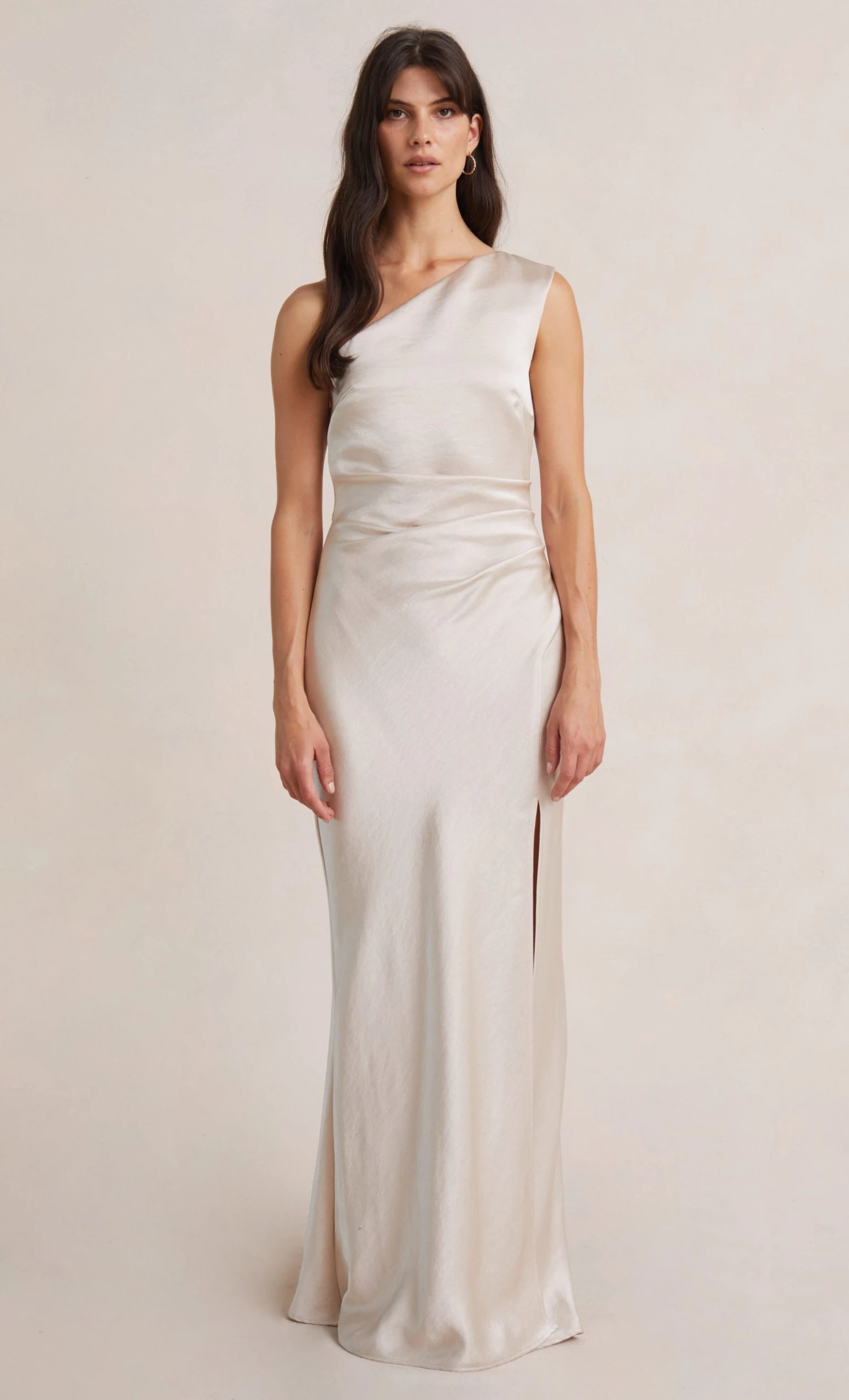 Flattering one shoulder maxi dress with asymmetrical neckline, side tuck detailing over the hips and waist, and a statement leg split.