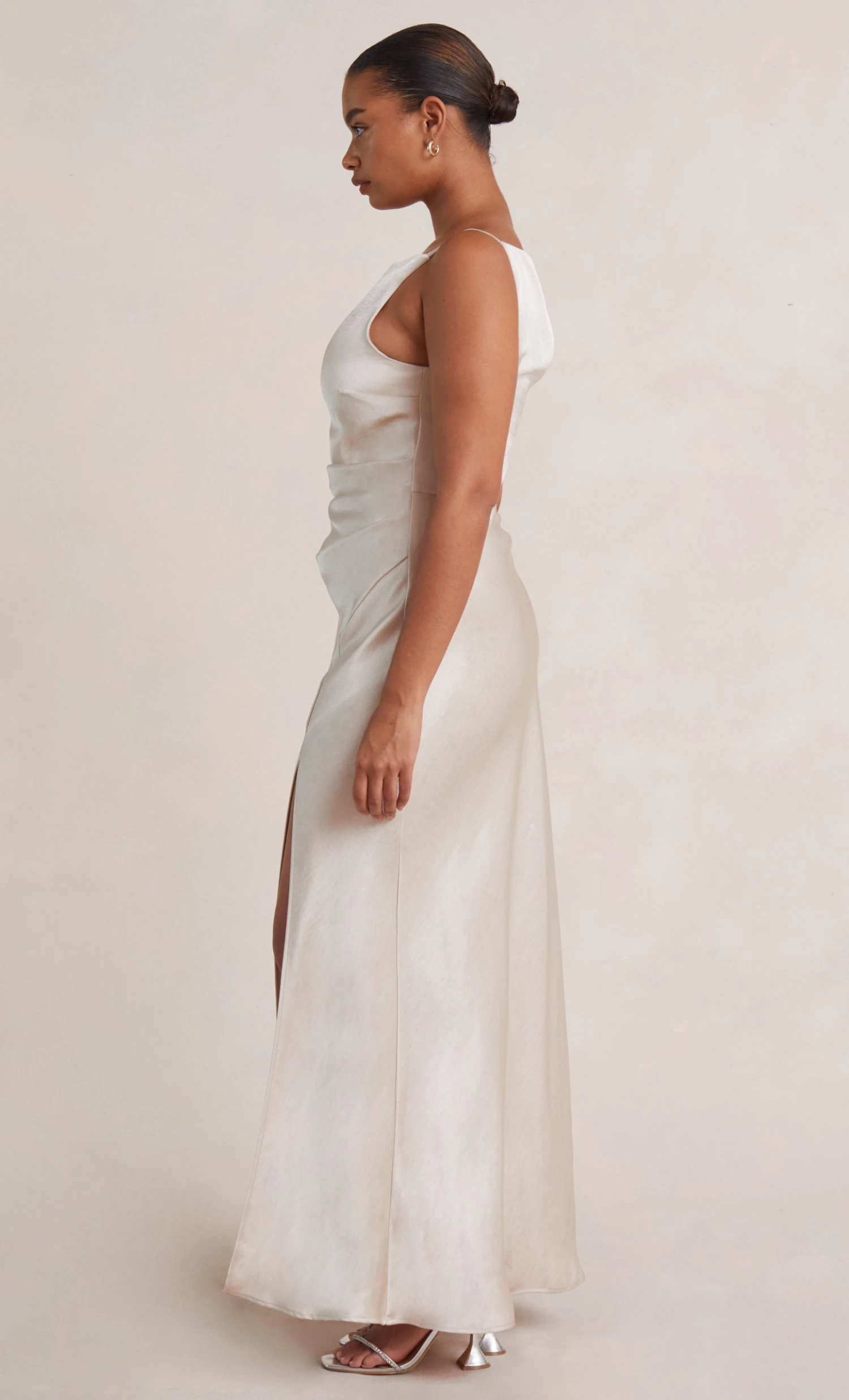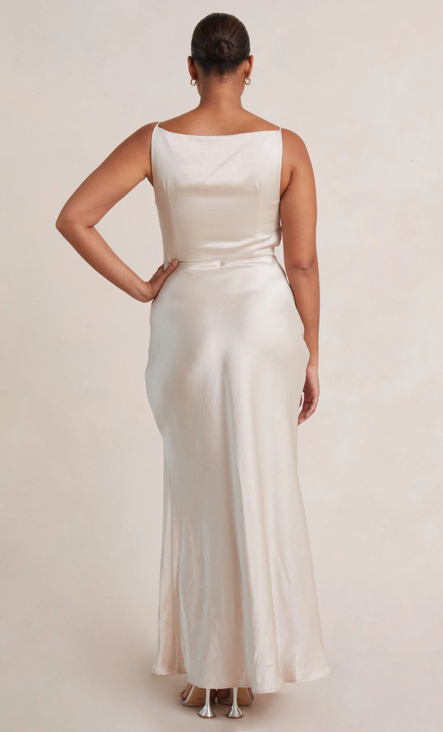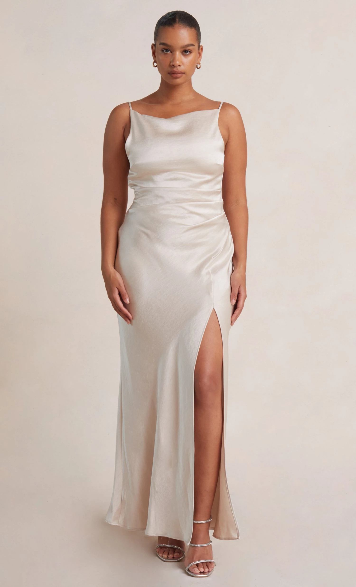 Best selling, high neck maxi dress featuring a flattering tuck detail that cinches the waist and creates a feminine silhouette. Dress is accessed through an invisible side zipper.