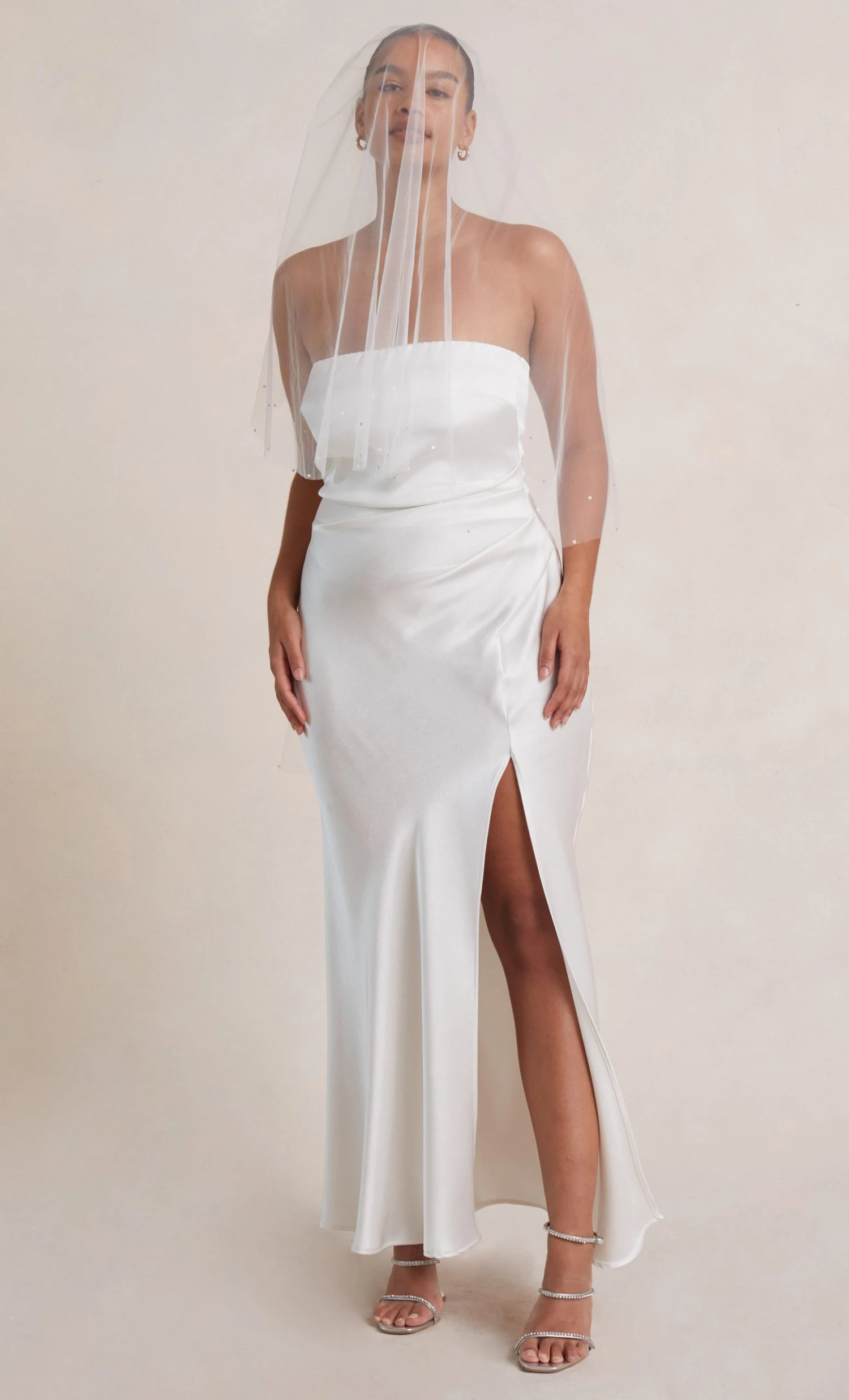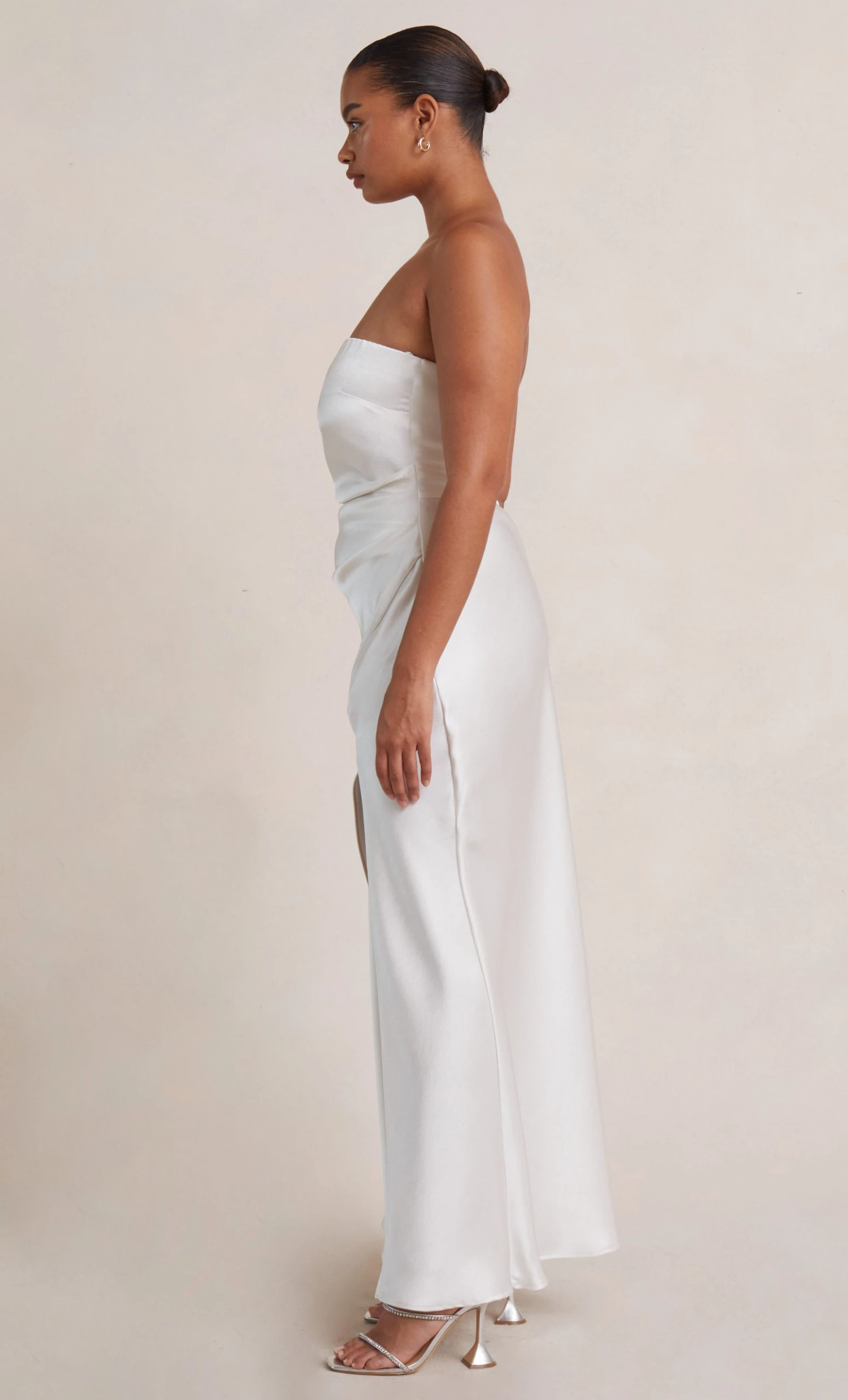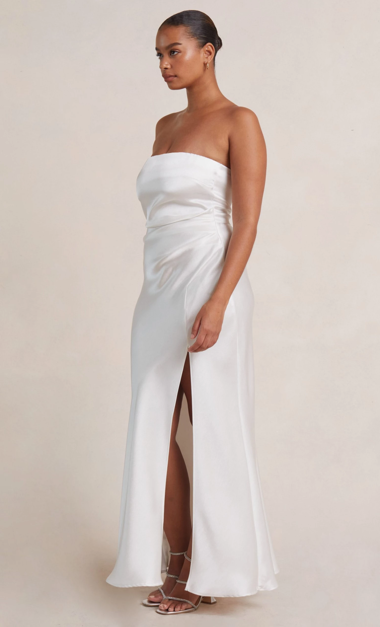 The Dreamer Strapless Dress is a flattering maxi length style with a straight neckline and a statement side leg split. The dress features a gathered effect at the waist and hips to compliment the silhouette and disguises any unwanted lines on the body.