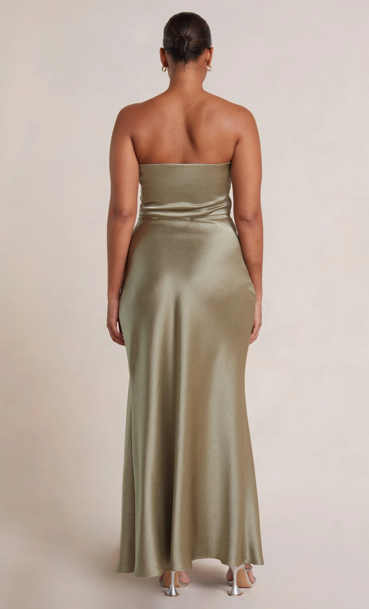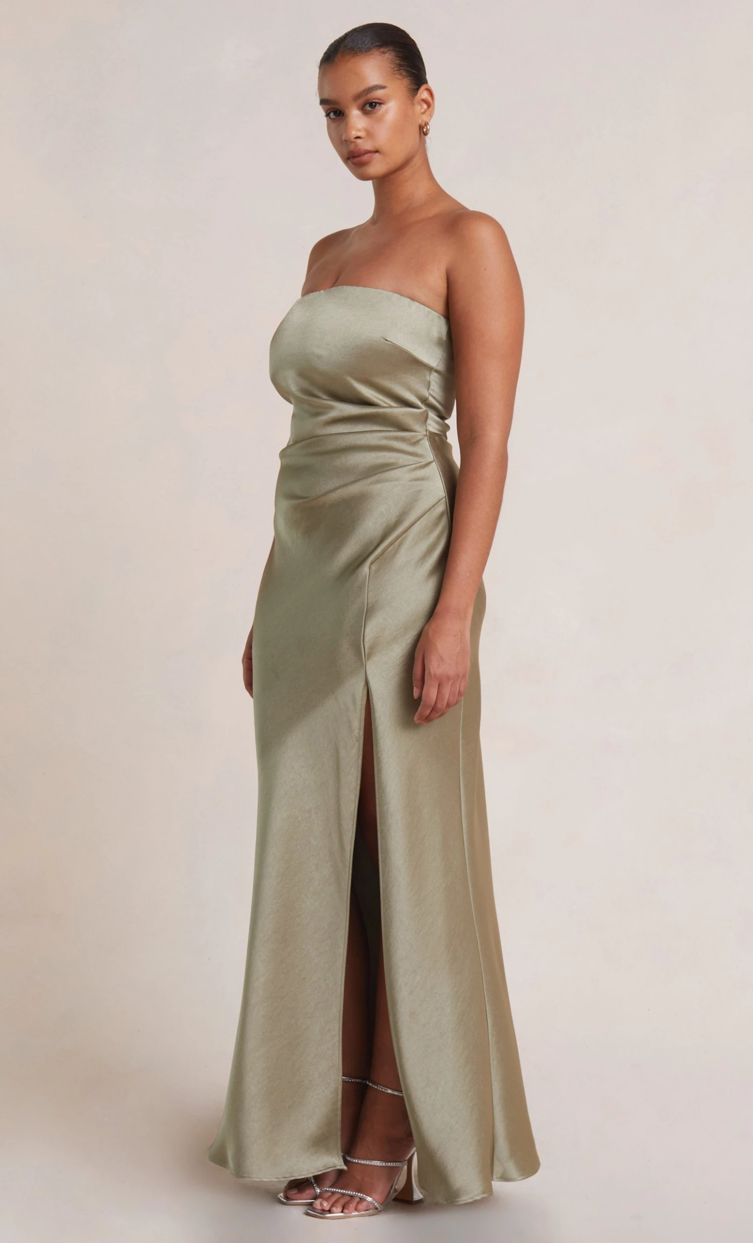 The Dreamer Strapless Dress is a flattering maxi length style with a straight neckline and a statement side leg split. The dress features a gathered effect at the waist and hips to compliment the silhouette and disguises any unwanted lines on the body.