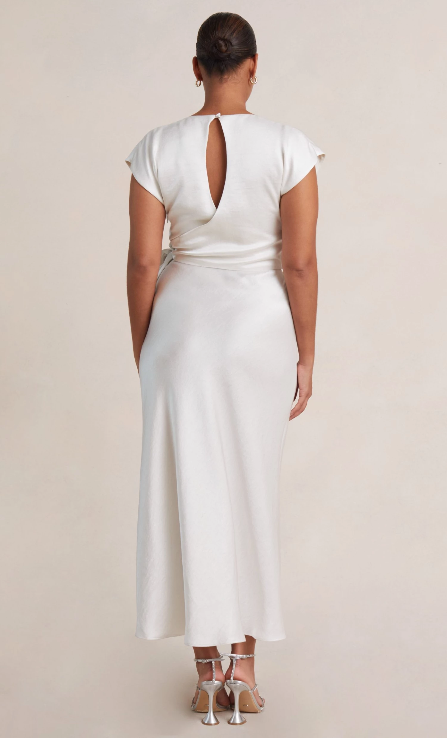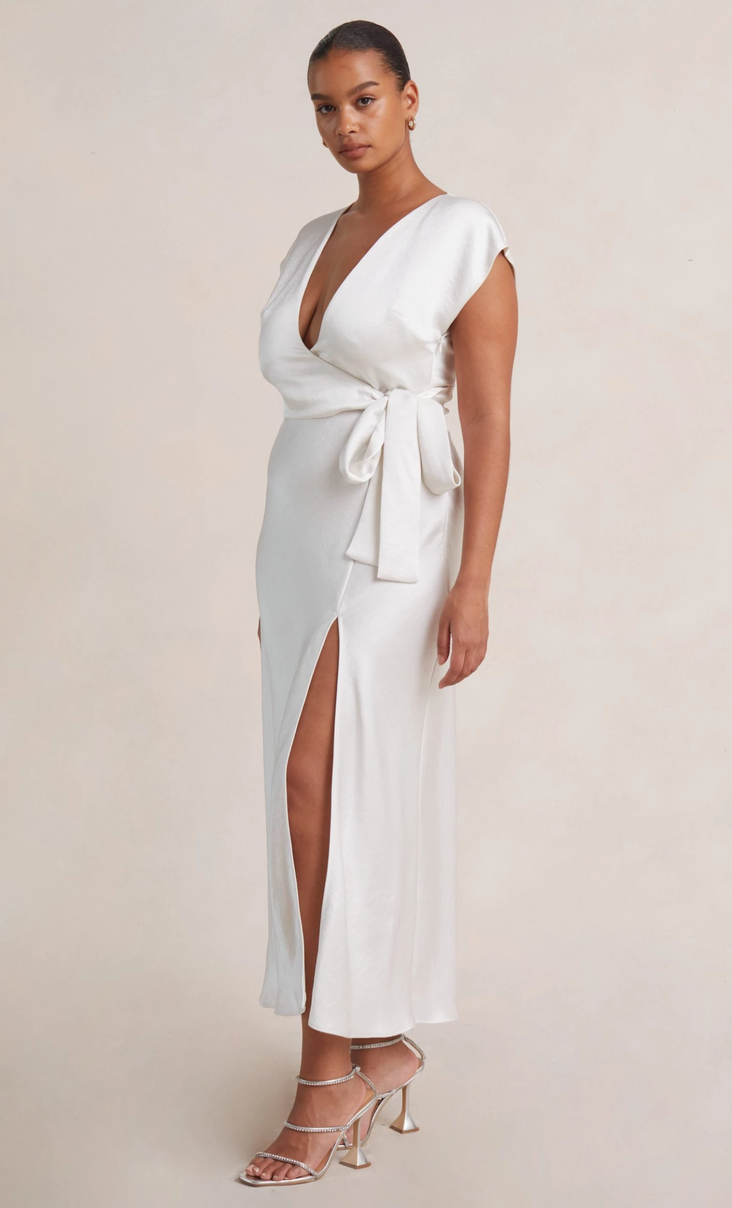 Flattering V-neckline wrap dress with keyhole back opening and a side tie detail at the waist. The Dreamer Wrap Dress is an easy to wear style that flatters all body types and is a beautiful option for those with a fuller bust.