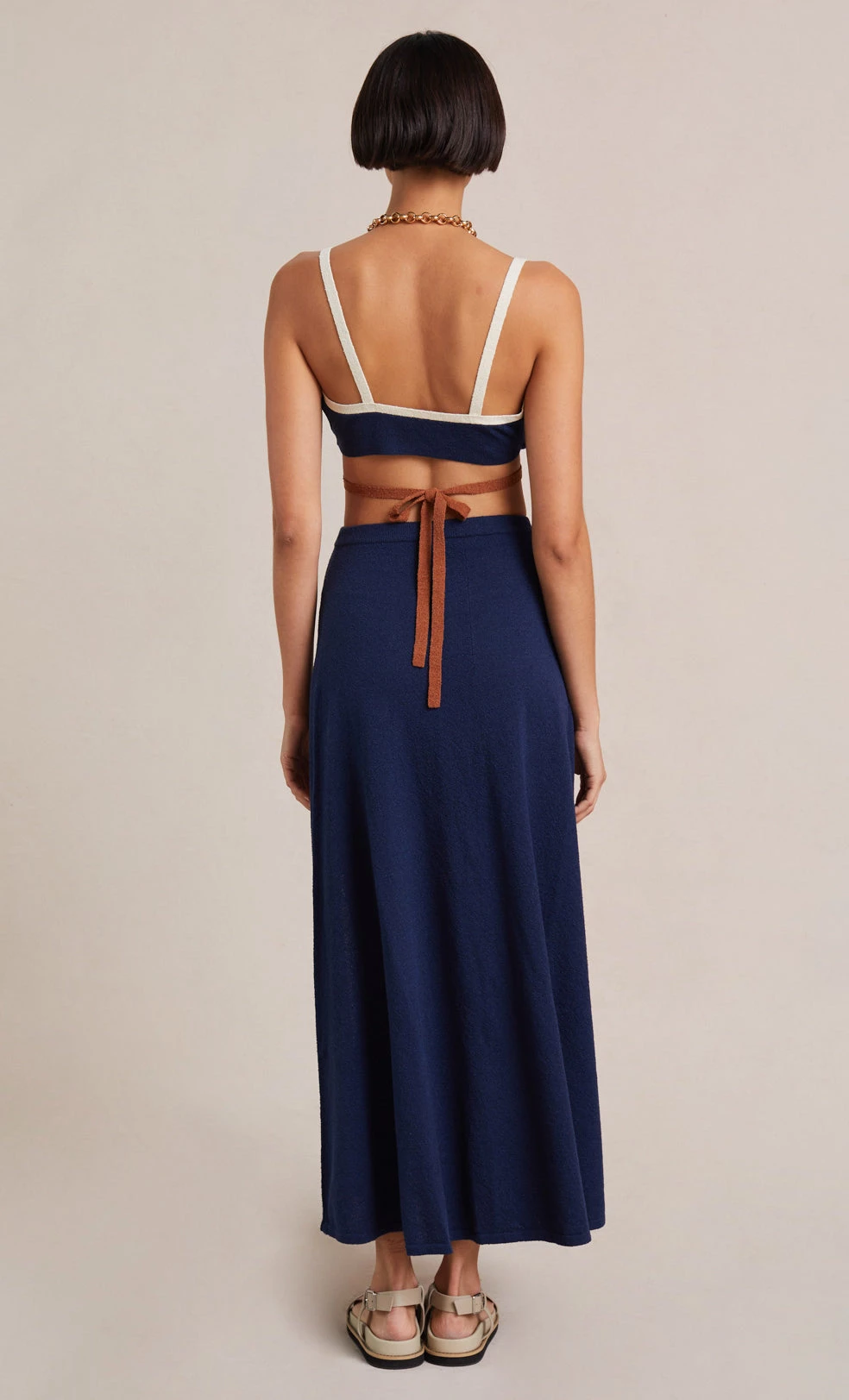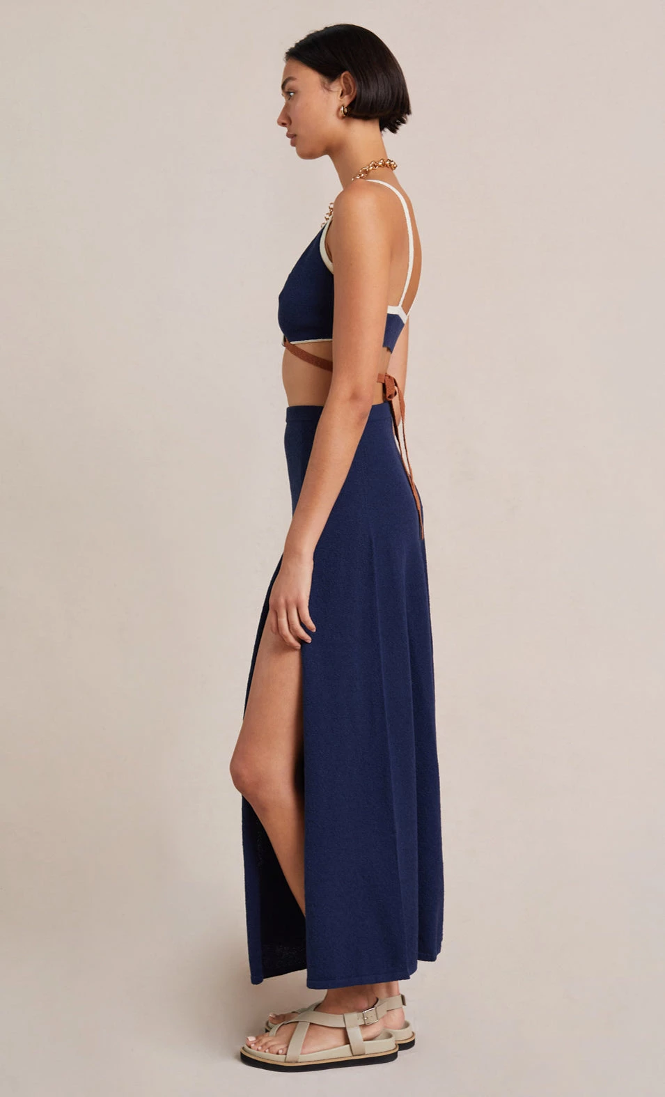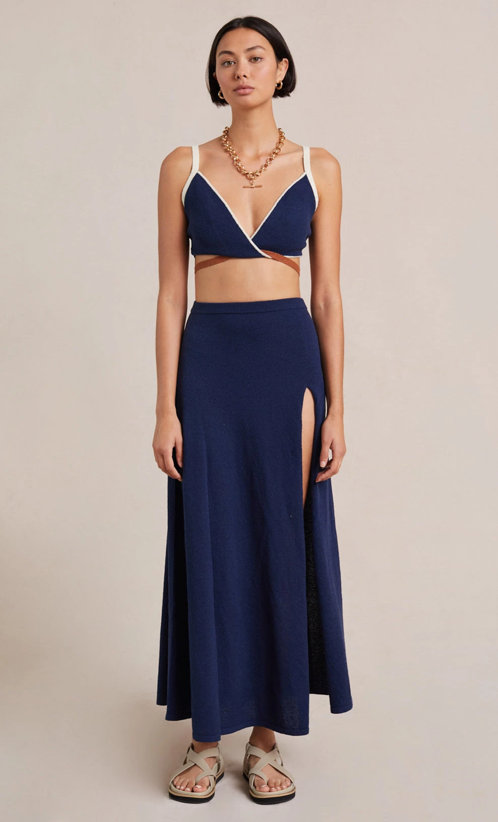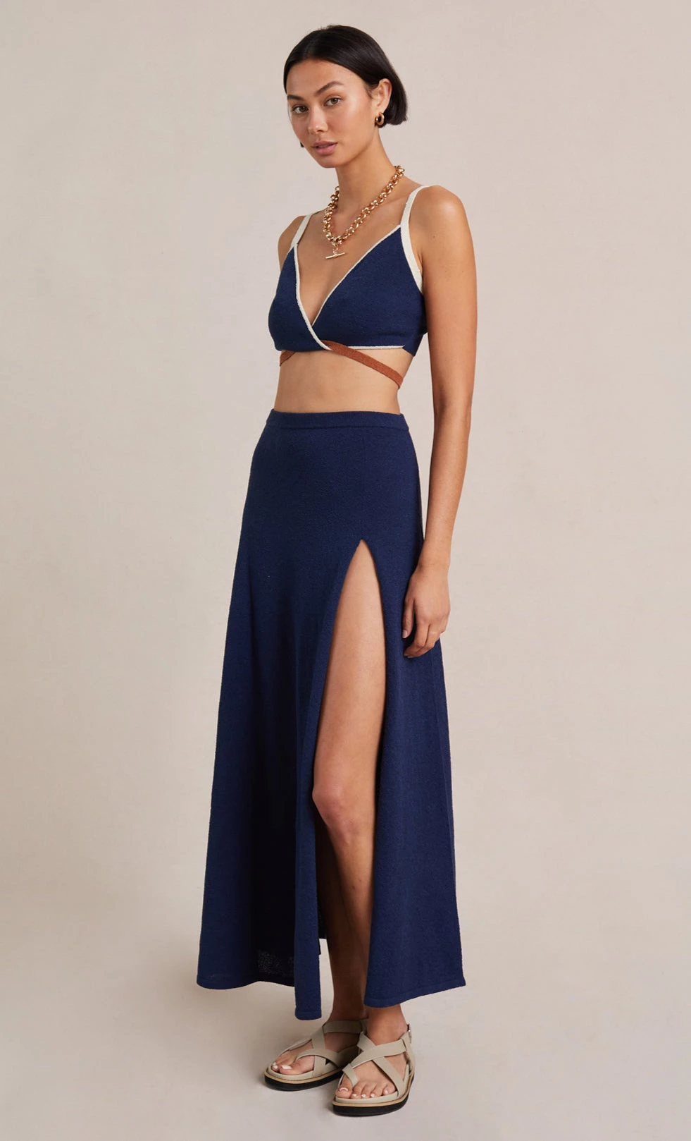 The Enzo Twist Knit Top is a strappy bralette style top spun from a comfy woven stretch knit fabric. The top features a plunging neckline with a feature contrasting trim and an adjustable tie that wraps around the waist and is fastened at the back. Styled with our matching Enzo Knit Skirt.