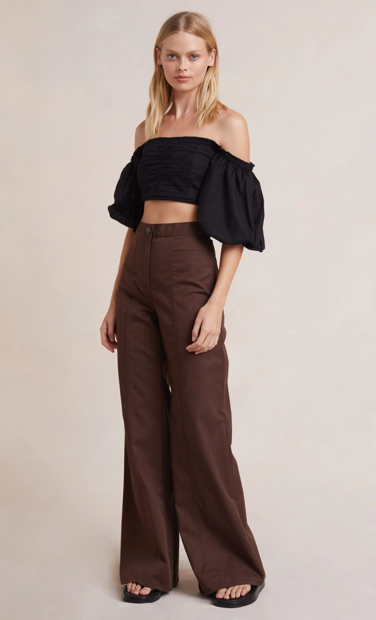 The Eugenie Top is a cropped bell sleeved style with voluminous puff sleeves that can be worn on or off the shoulders. The top features a straight neckline with a ruffle trim and a fitted gathered bust.