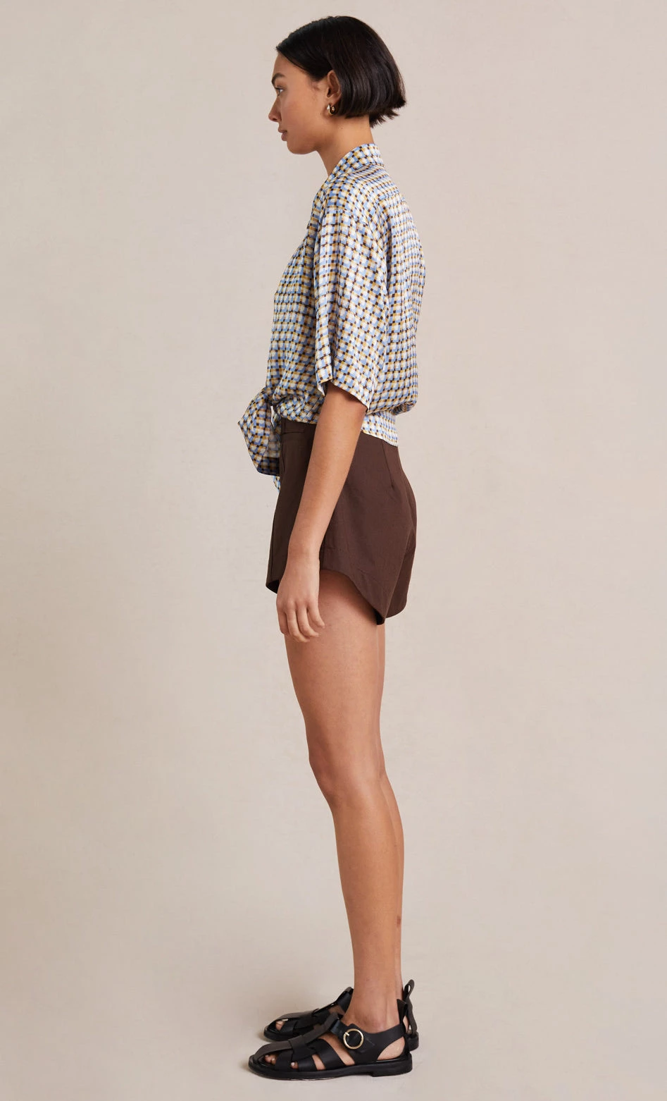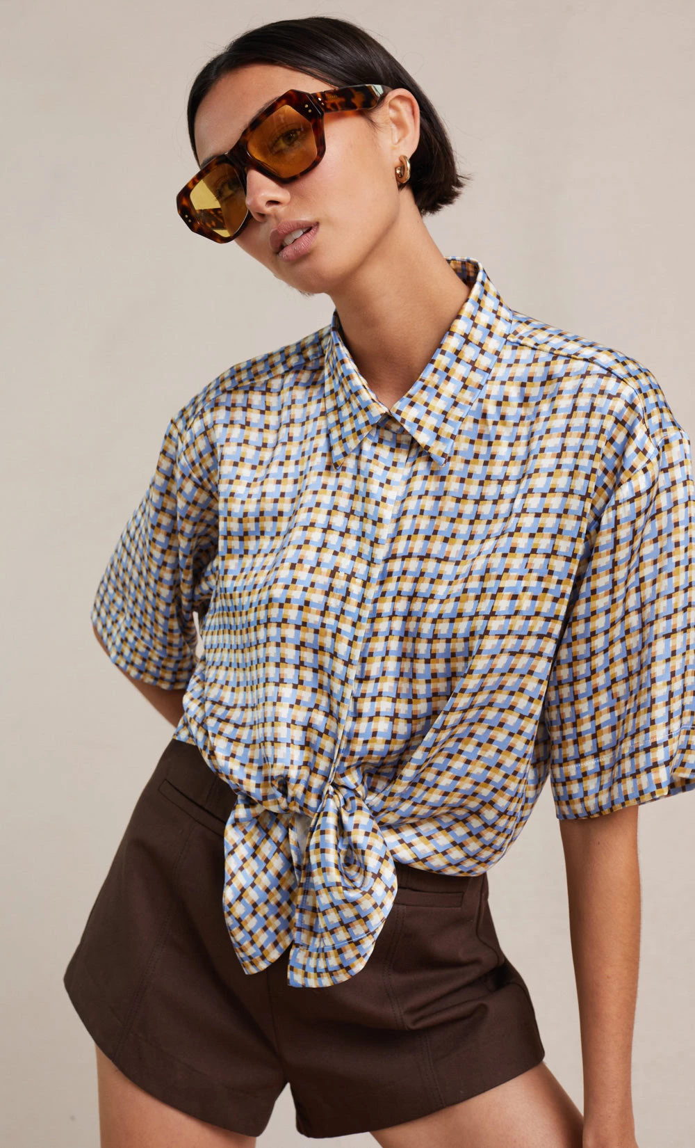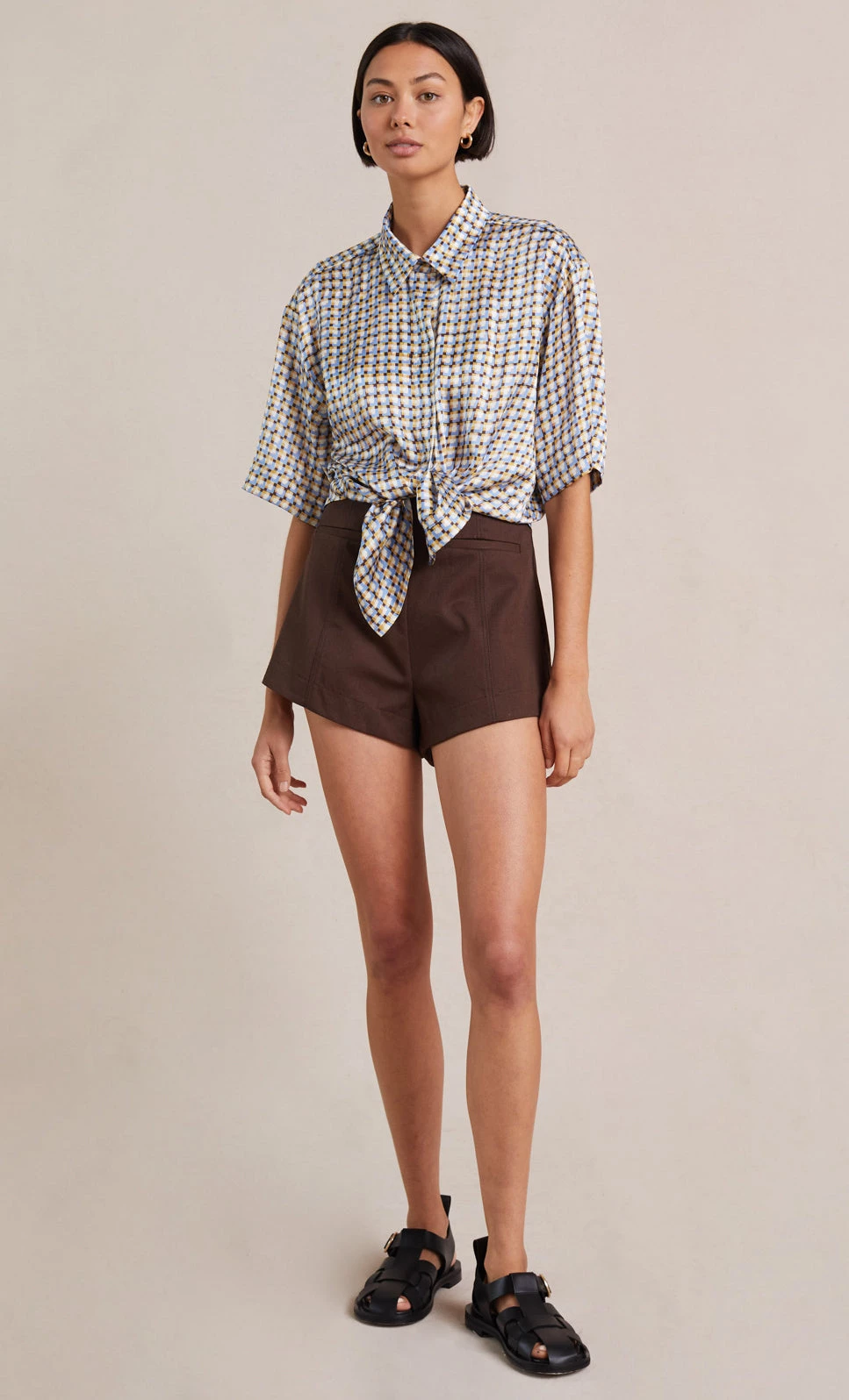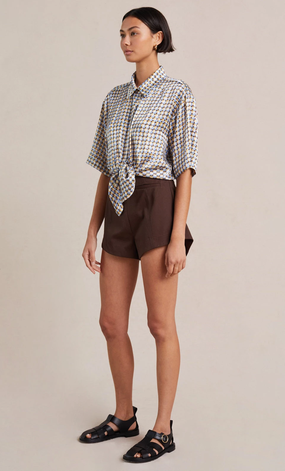 The Frankie Shirt is a vintage inspired button up style cut from a signature geo print silk fabric. The shirt features a neat collar and oversized elbow-length sleeves. The relaxed, boxy fit style is cinched in with an adjustable tie at the front waist. Styled with our Axel Short.