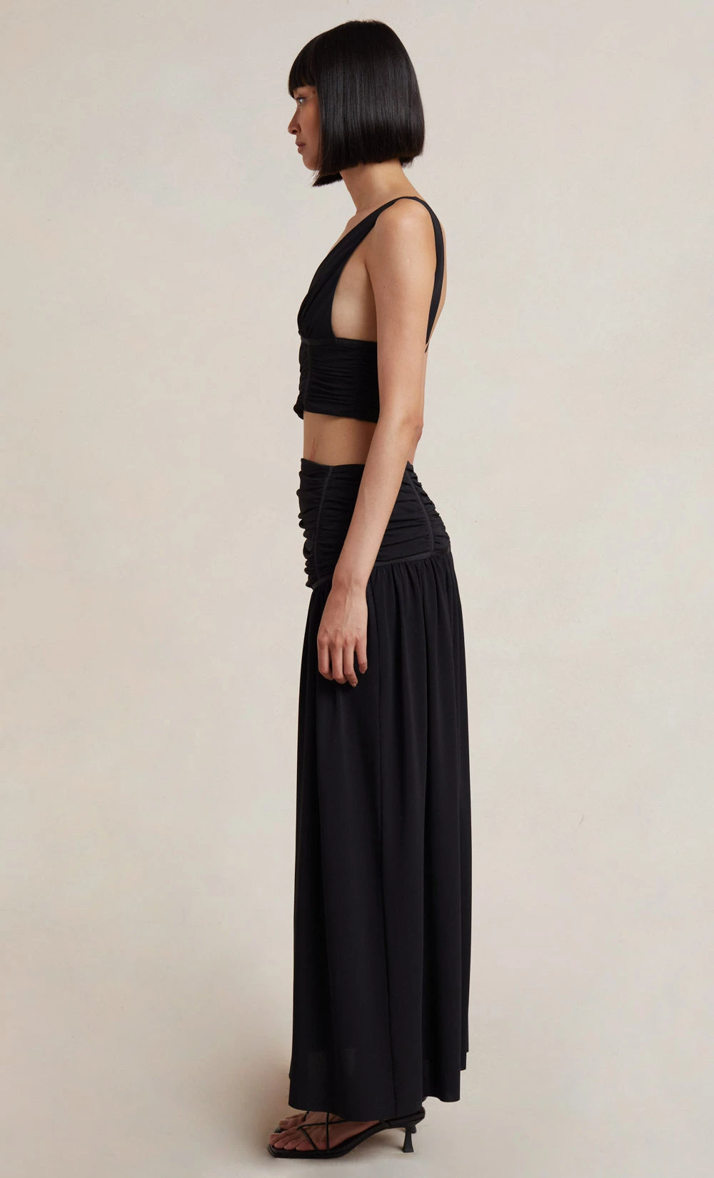 The Gwen Top is cut from a fluid crepe fabric in a fitted cropped silhouette. This eventwear style features a gathered bust with a plunging neckline with a gathered ruched panel hem. Styled with our matching Gwen Maxi Skirt.