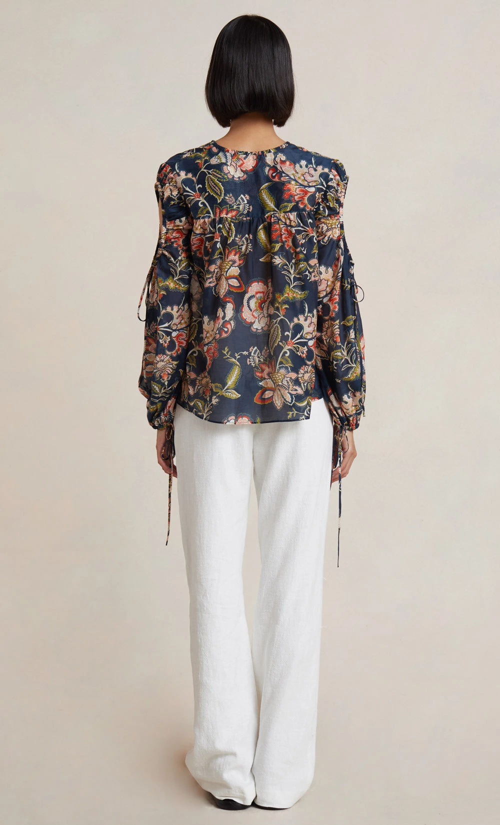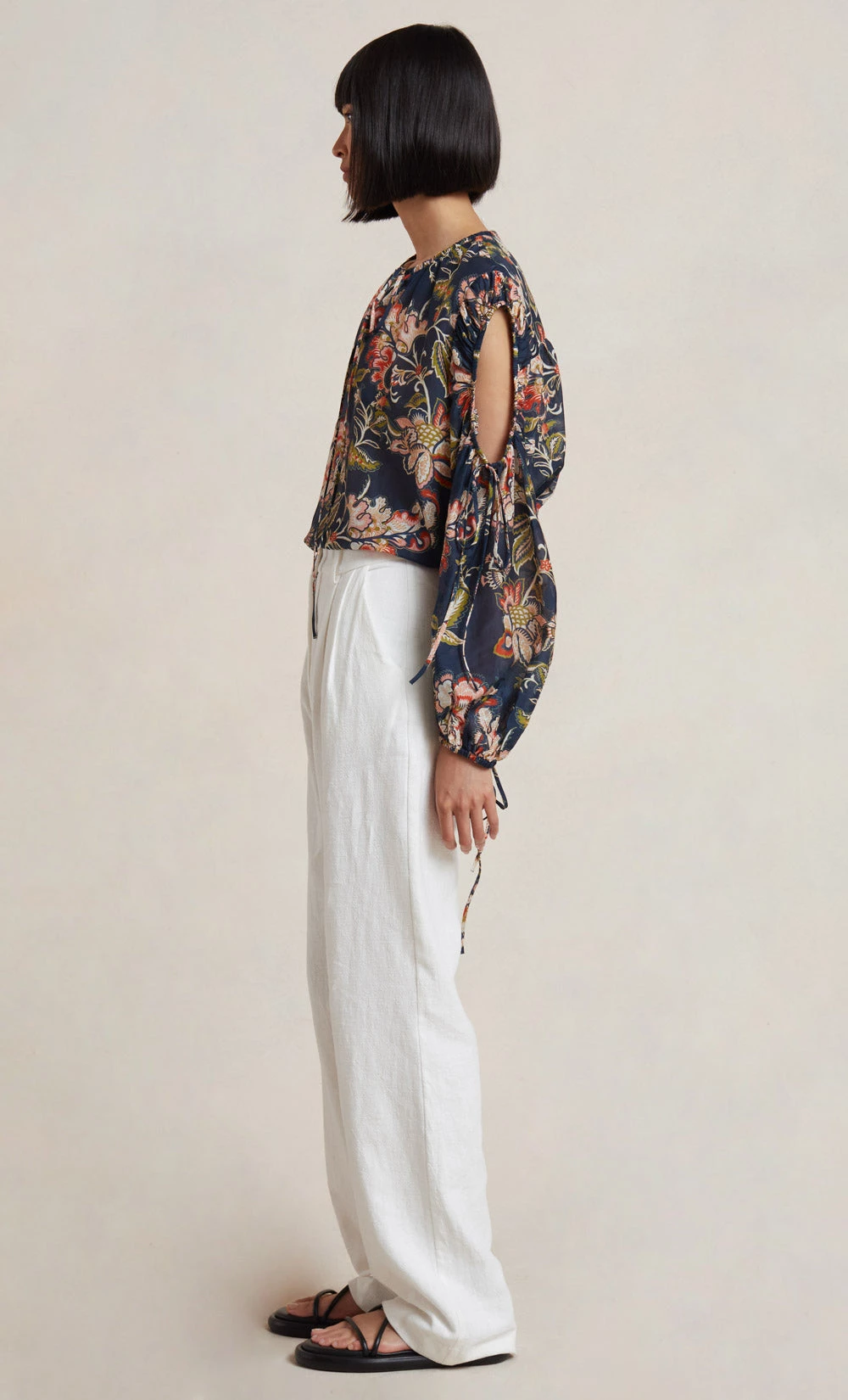 Cut from a breezy signature floral print fabric, the Lori Blouse is an easy-to-wear style with a plunge neckline finished with an adjustable tie across the neckline. The blouse features billowy puff sleeves complete with cutout details and self-ties along the sleeves and cuffs. Styled with our Bonnie Pant.