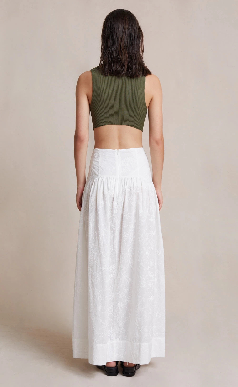 The Mason Knit Top is a cropped style spun from a comfy ribbed knit fabric. The top features a high neckline with wide shoulder straps and a statement curved hem.