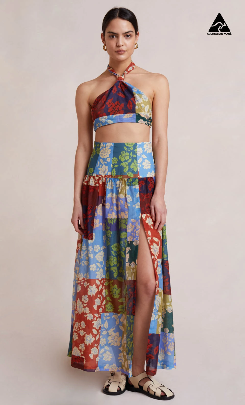 The Woodstock Top is cut from a signature patchwork floral print fabric in a fitted cropped silhouette. This easy-to-wear style features a high halter neckline with self-ties and an elasticated back strap. Styled with our matching Woodstock Skirt.