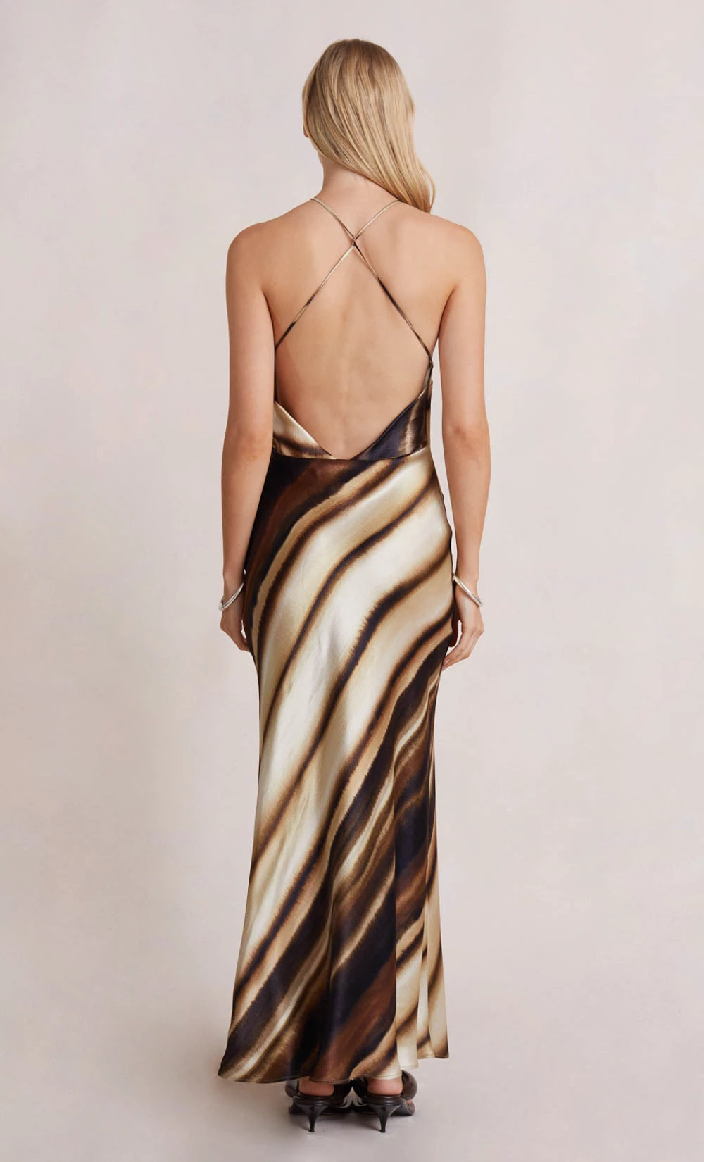 Cut on the bias from a lustrous print fabric, the Watercolour Maxi Dress is a refined eventwear style. The halter-neck dress is complemented with gold O-ring hardware, a high side-leg split and thin straps that cross and fall into a plunging, cowl open back. The dress skims along the body with a maxi-length flowy skirt.