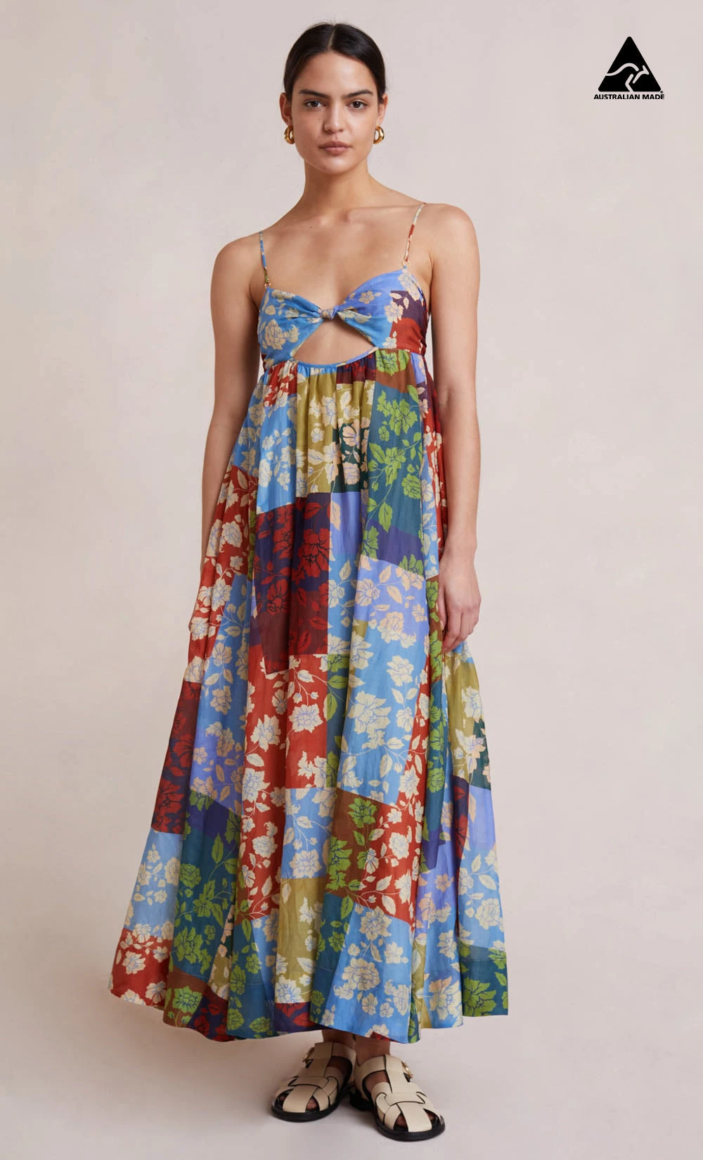 The Woodstock Maxi Dress is an easy-to-wear cut from a signature patchwork floral print fabric. The maxi dress features a sweetheart neckline with a knotted twist-front at the fitted gathered bust and thin rouleau straps accented by O-ring details. The dress is finished with a front cutout detail below the bust that falls into a flowy maxi skirt.